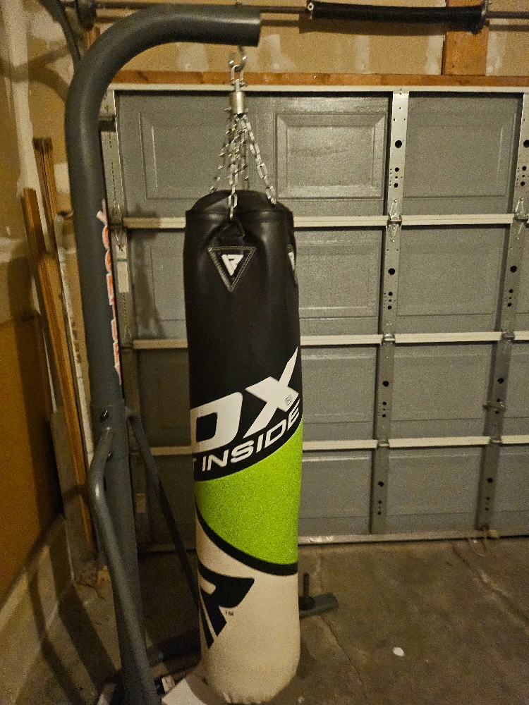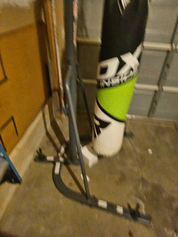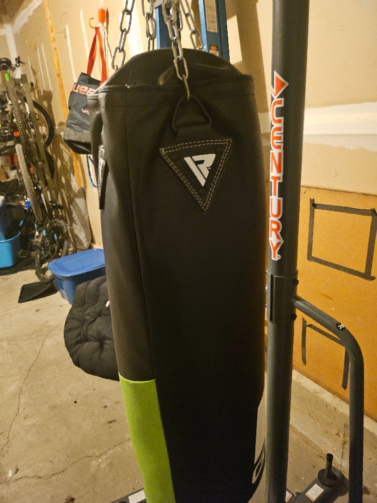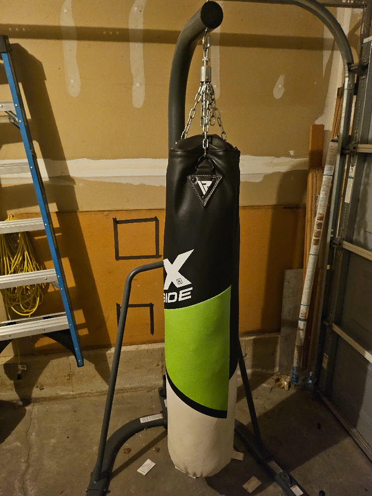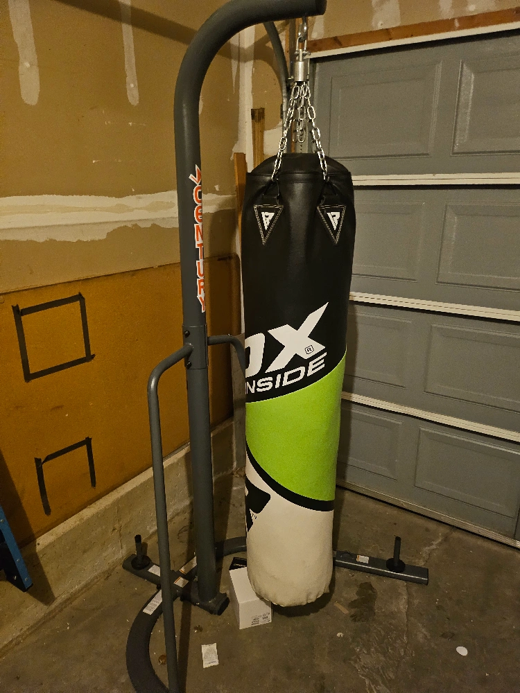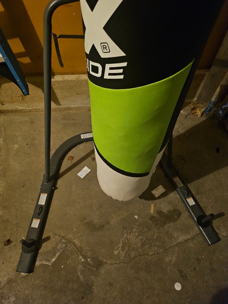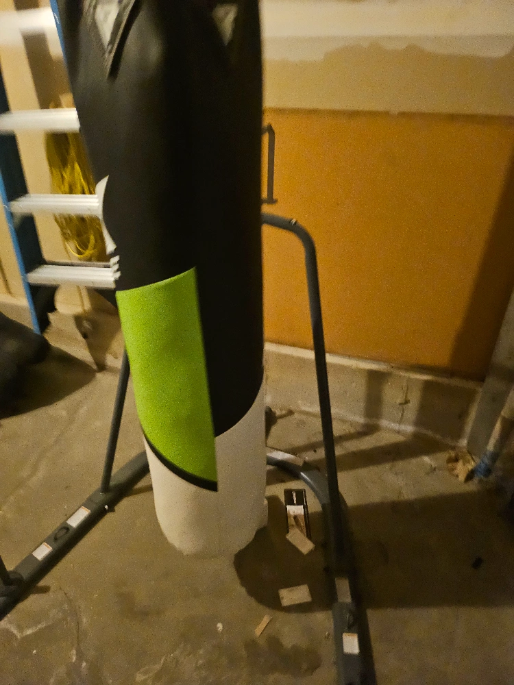 Selling a punching bag with a stand. The bag is black, white, and green. The stand is grey. Great for working out at home!