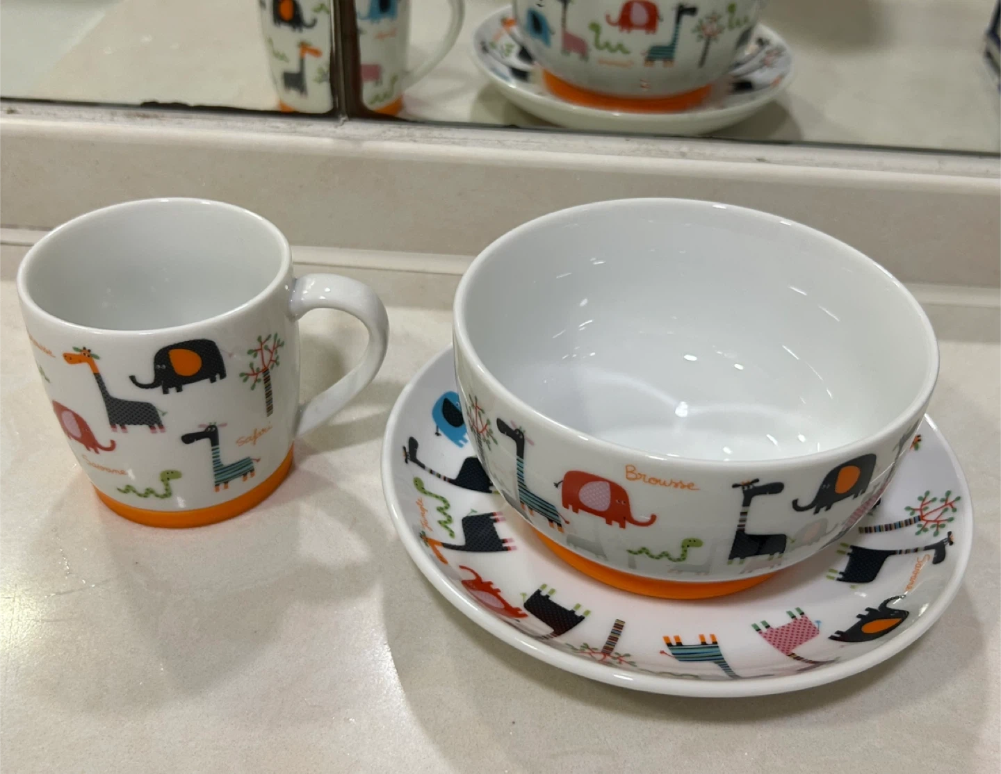 Super cute ceramic mug, bowl, and plate set with fun animal designs! Perfect for kids or anyone who loves a touch of whimsy at mealtime. The bottoms have orange silicone rings to prevent slipping!