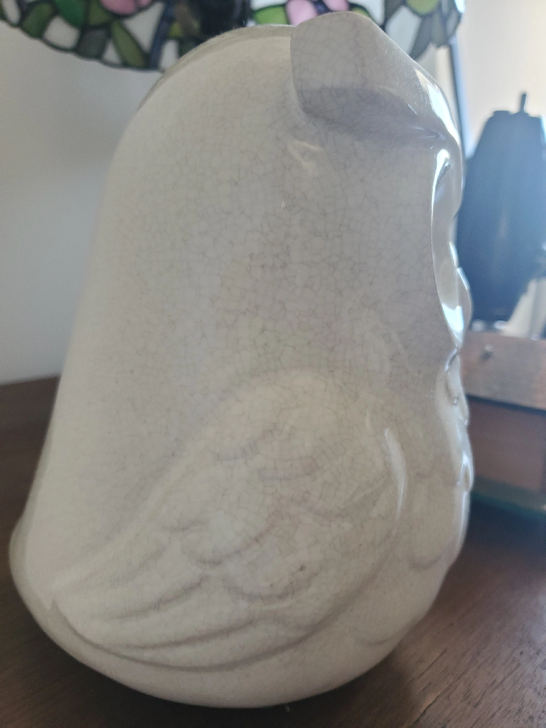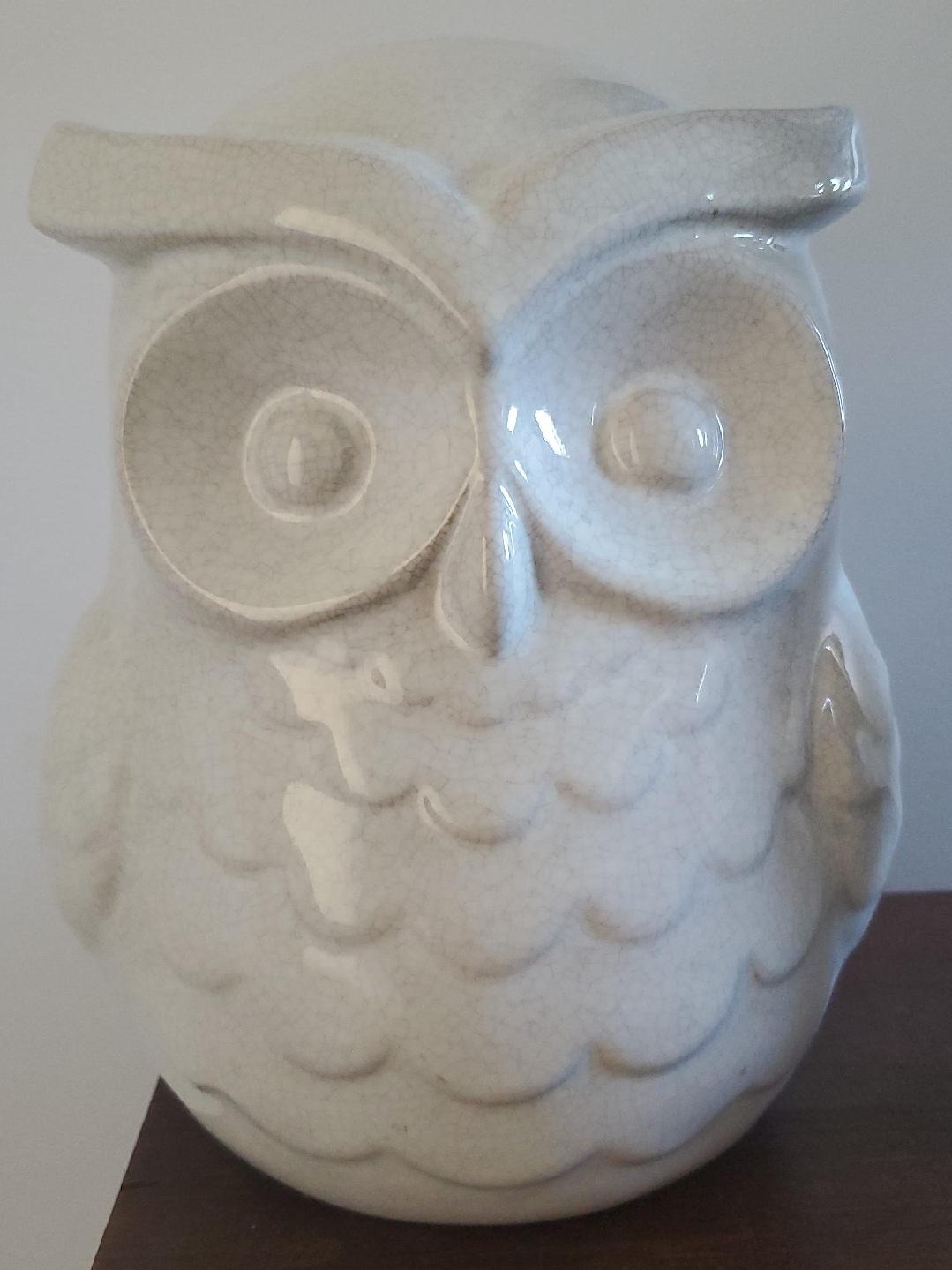 Here's a cute ceramic owl figurine! It's in great shape and would look lovely on a shelf or desk. The texture is slightly crackled, giving it a unique, vintage feel. It's a great decorative piece for any owl lover! approximately 8" tall