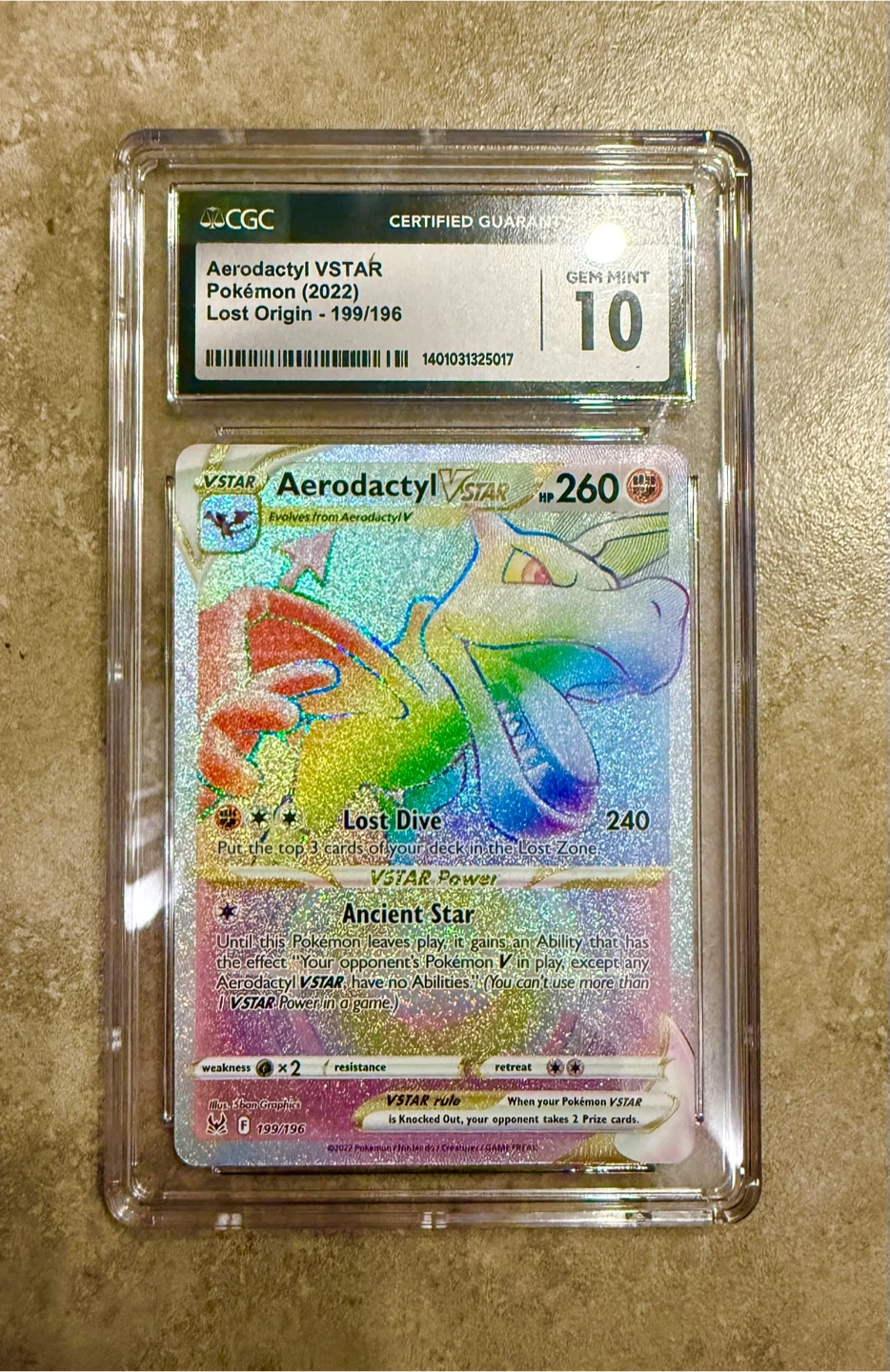 Selling an Aerodactyl VSTAR Pokemon card from the Lost Origin series (199/196). It's been graded as Gem Mint by CGC, ensuring top quality! This card is a great addition to any collection