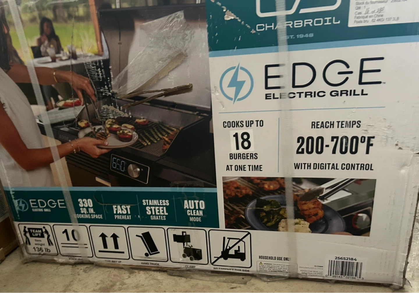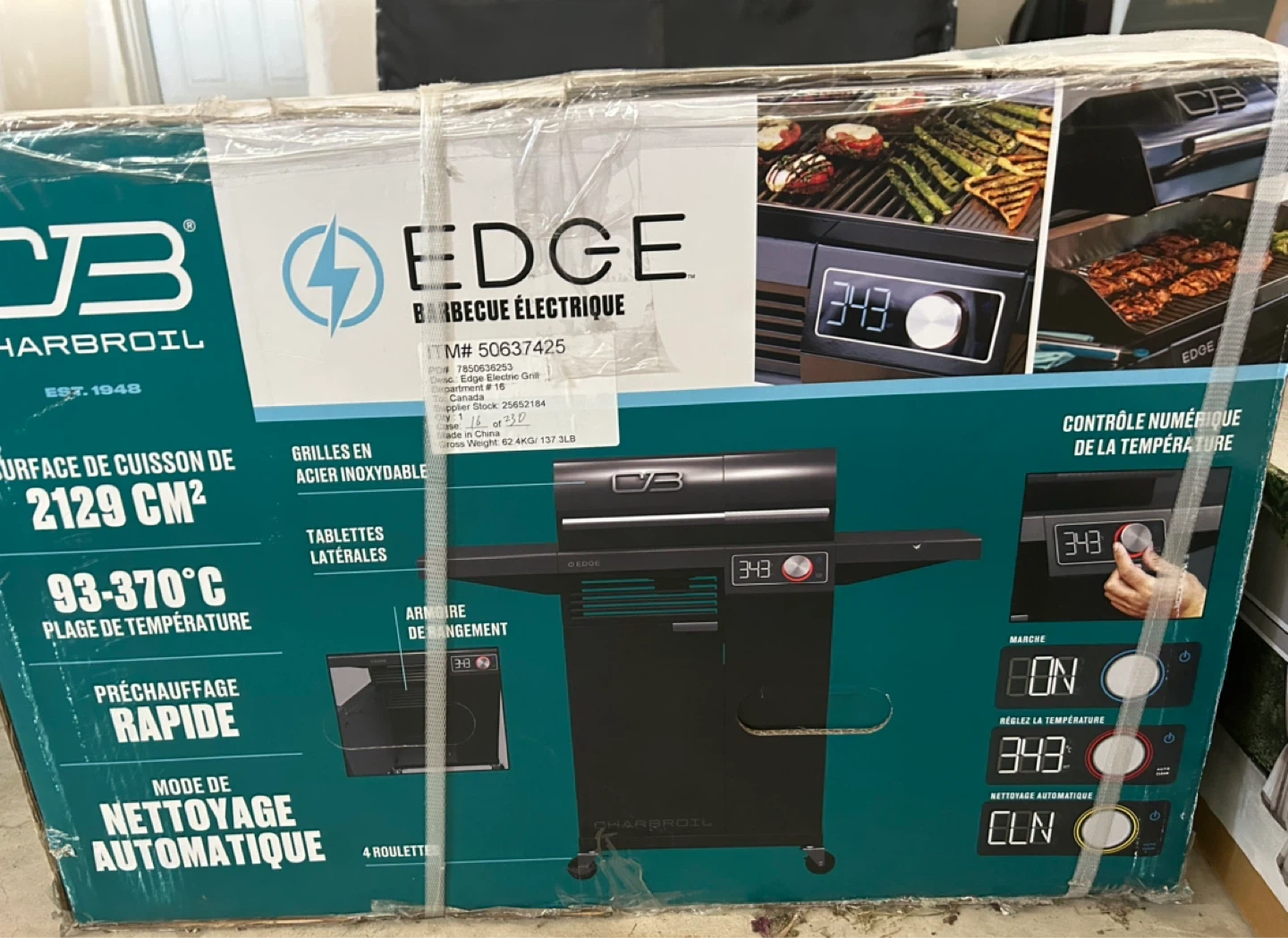 Selling a brand new Char-Broil Edge Electric Grill, still in its original packaging! This grill cooks up to 18 burgers at a time and reaches temperatures from 200-700°F with digital control. It features 330 sq. in. of cooking space, fast preheat, stainless steel grates, and an auto-clean mode. The box includes the grill and all original components. It also has a surface de cuisson de 2129 cm². Get ready for some great grilling!