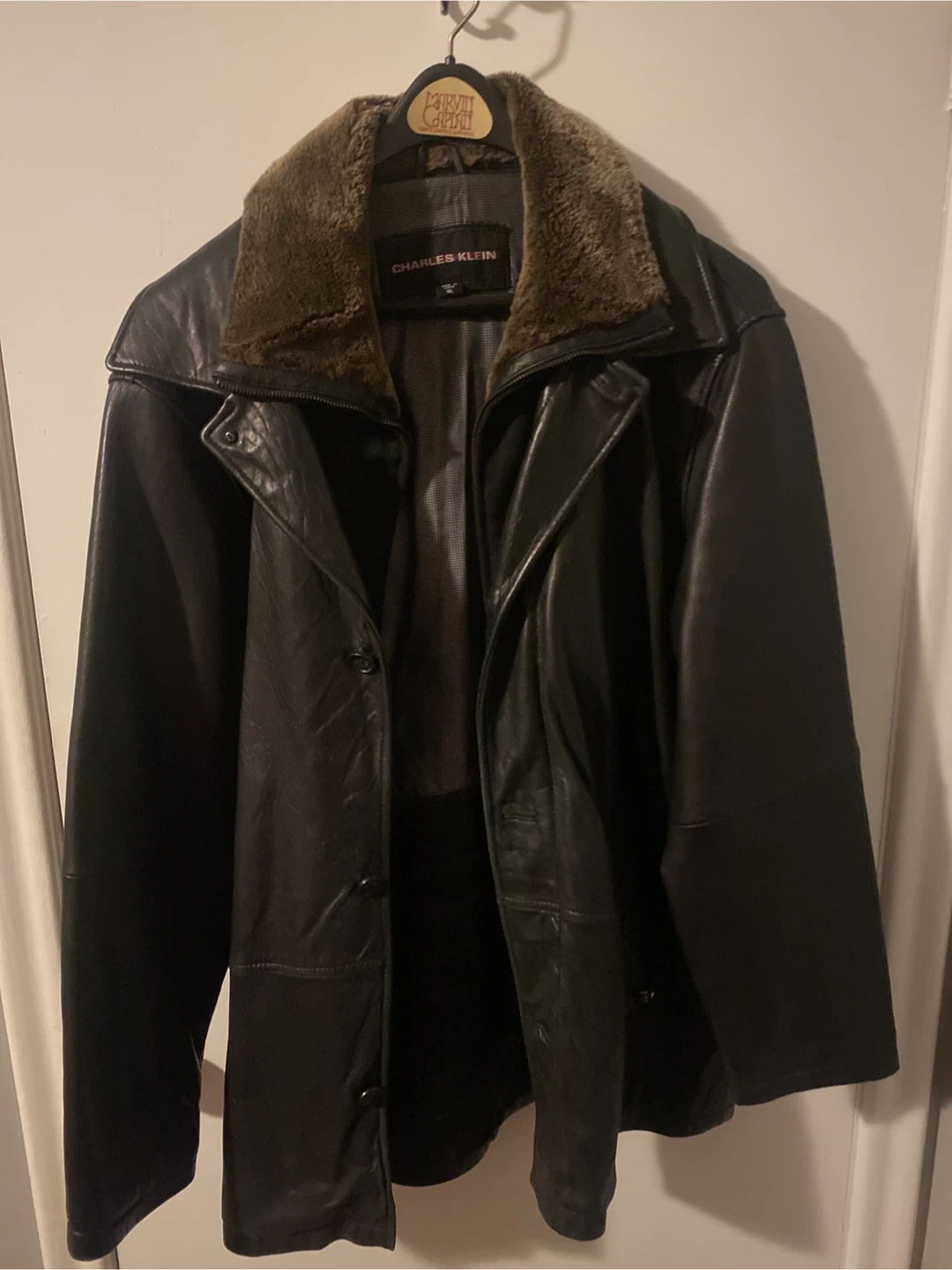 Selling a Charles Klein leather jacket in size XL. It's black and features a zip out fur collar. Perfect for keeping warm and stylish during the colder months!