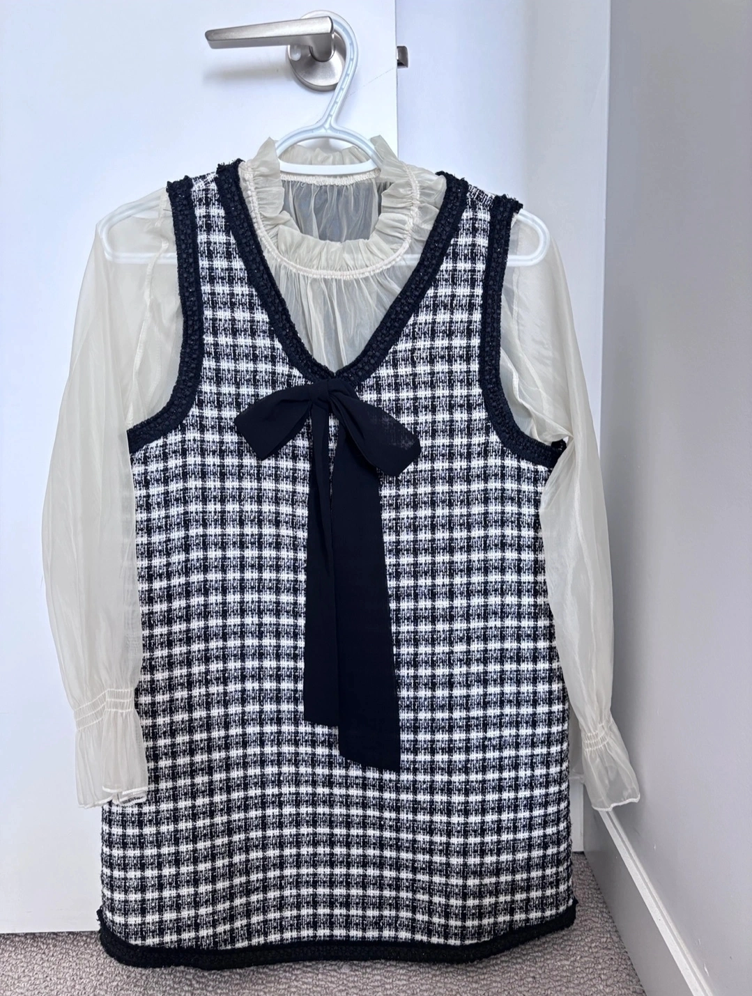 Cute checkered dress with a sheer mesh blouse! The dress has a black bow detail and black trim. Pick-up, cash only.
