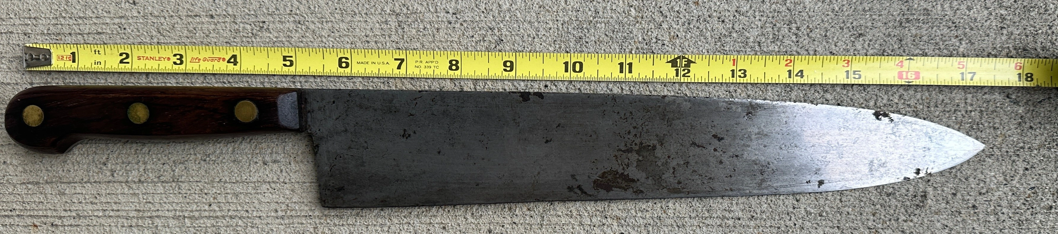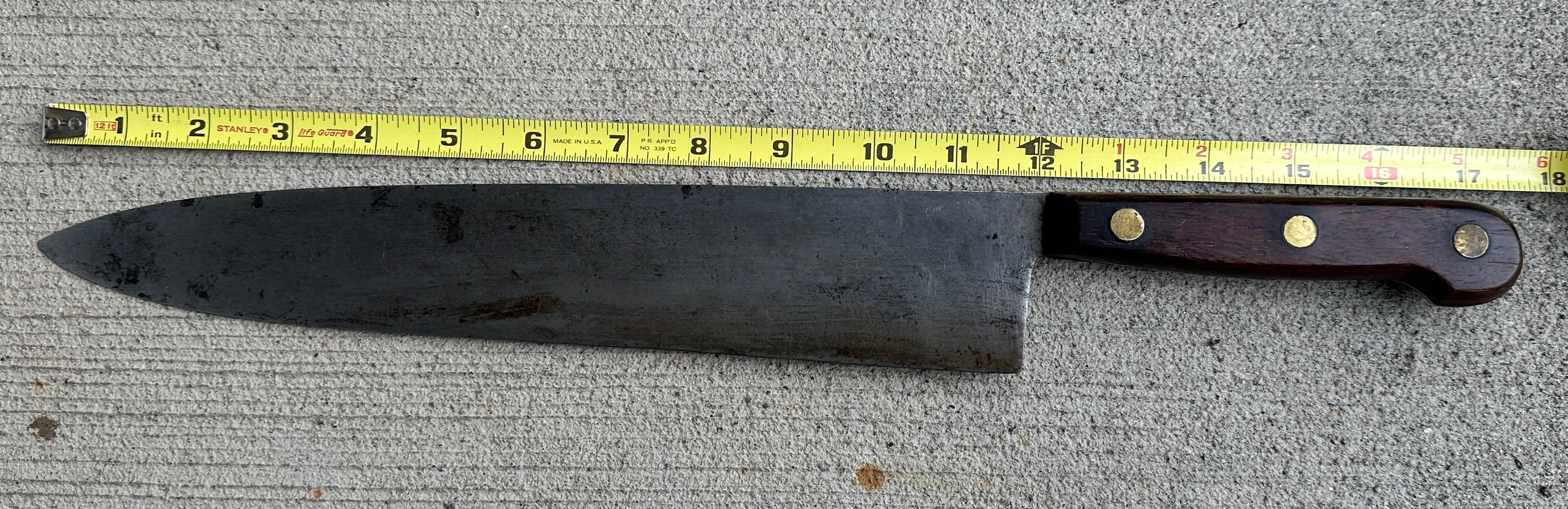 This blade is 12" x 2", has some surface rust which I will just leave . The handle is in great condition.
