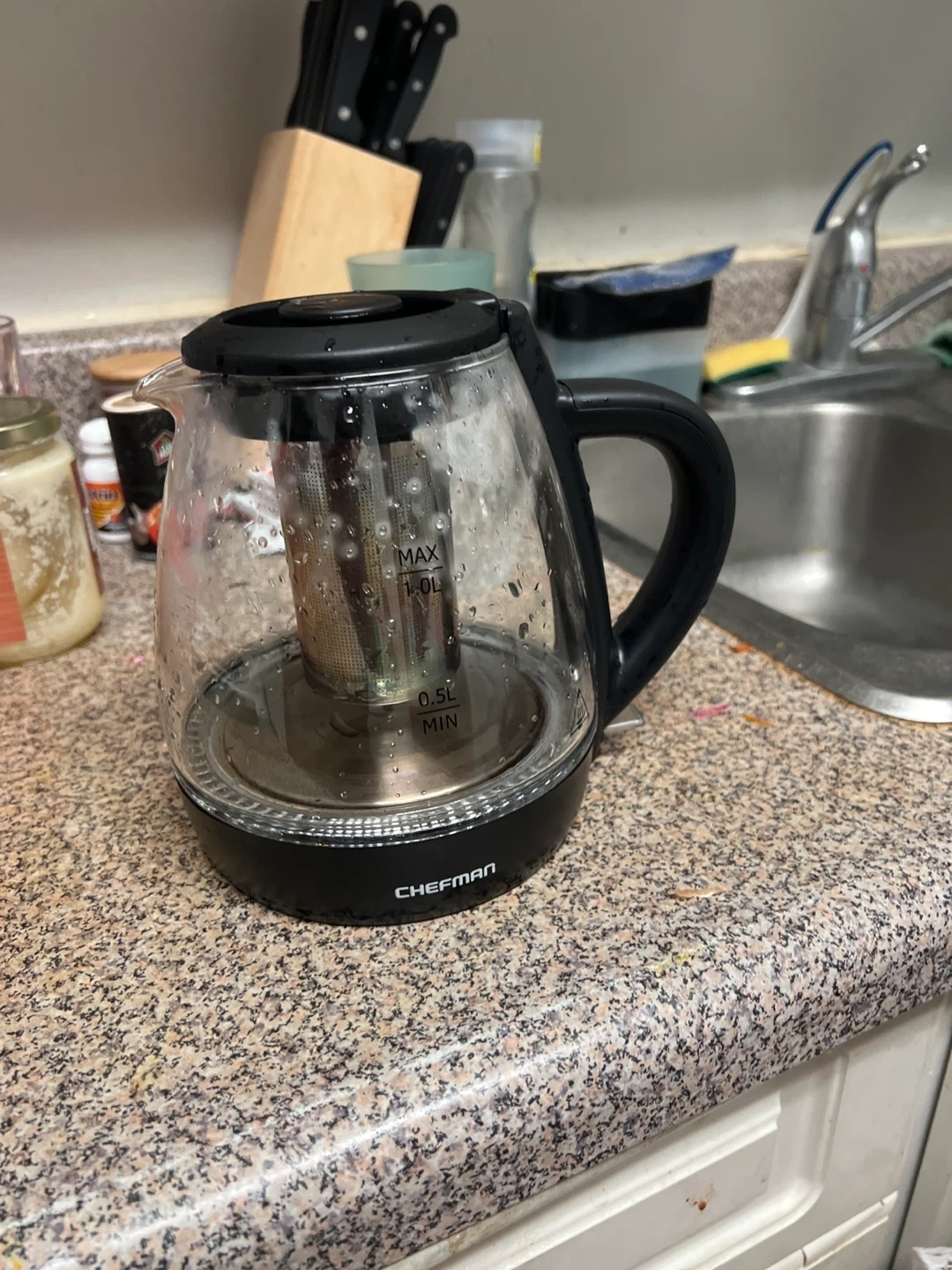 Selling a Chefman electric glass kettle! It has a sleek design and a built-in infuser for tea or fruit. The kettle is in great condition and heats water quickly. Perfect for making your favourite hot beverages!