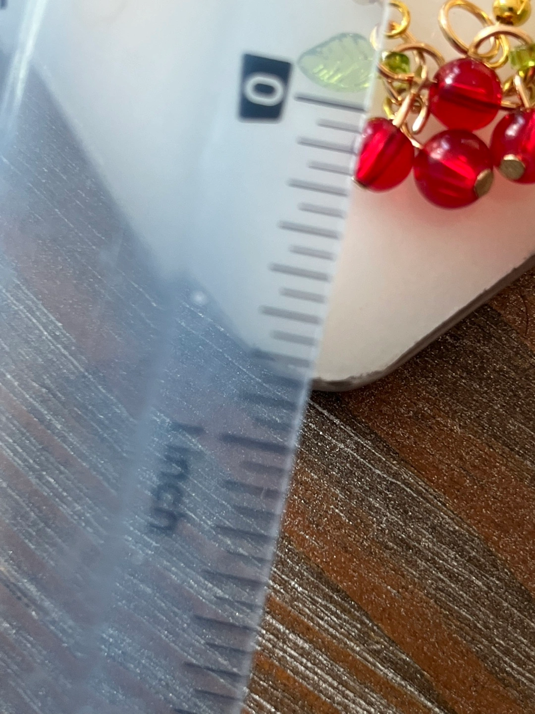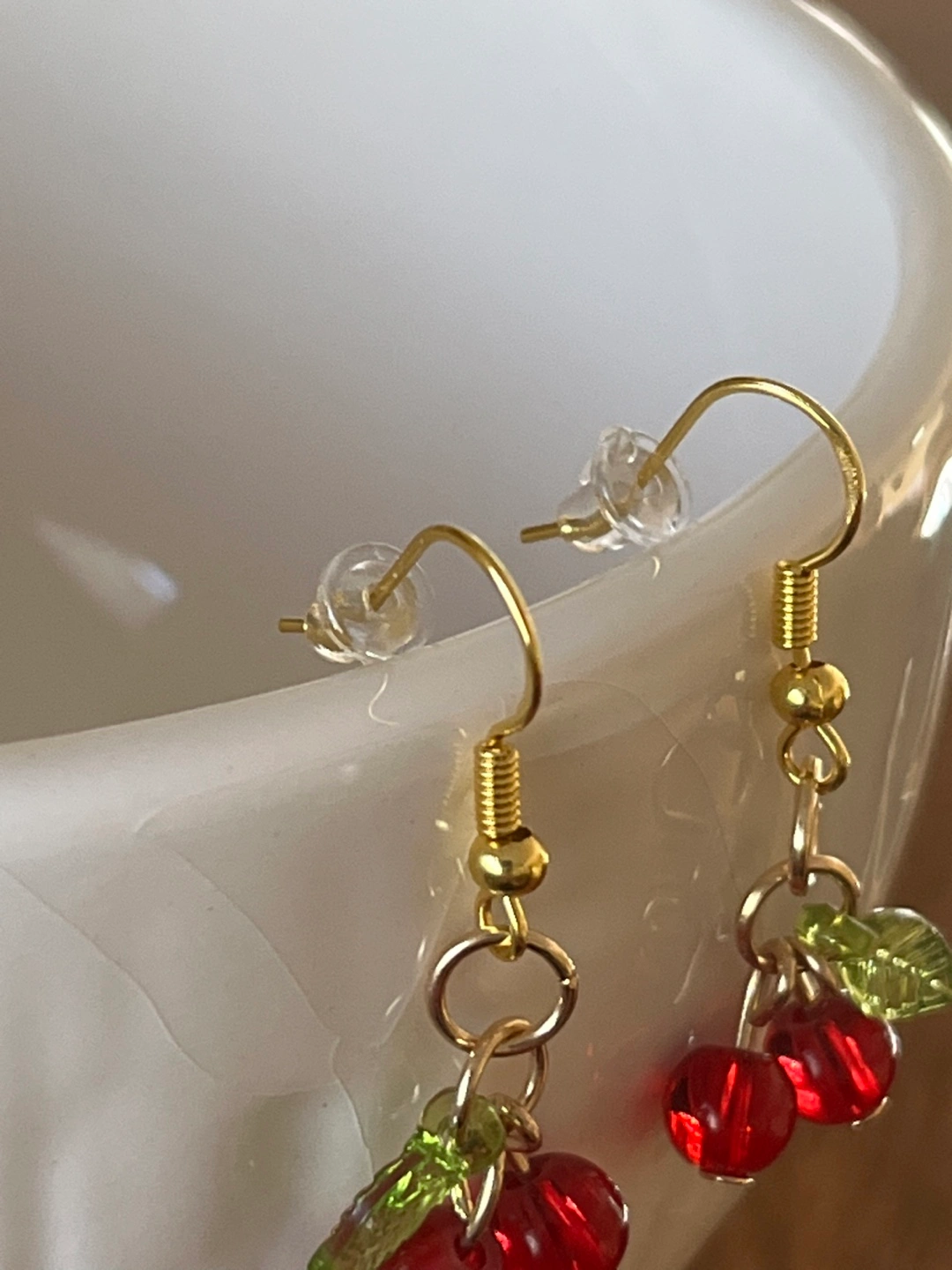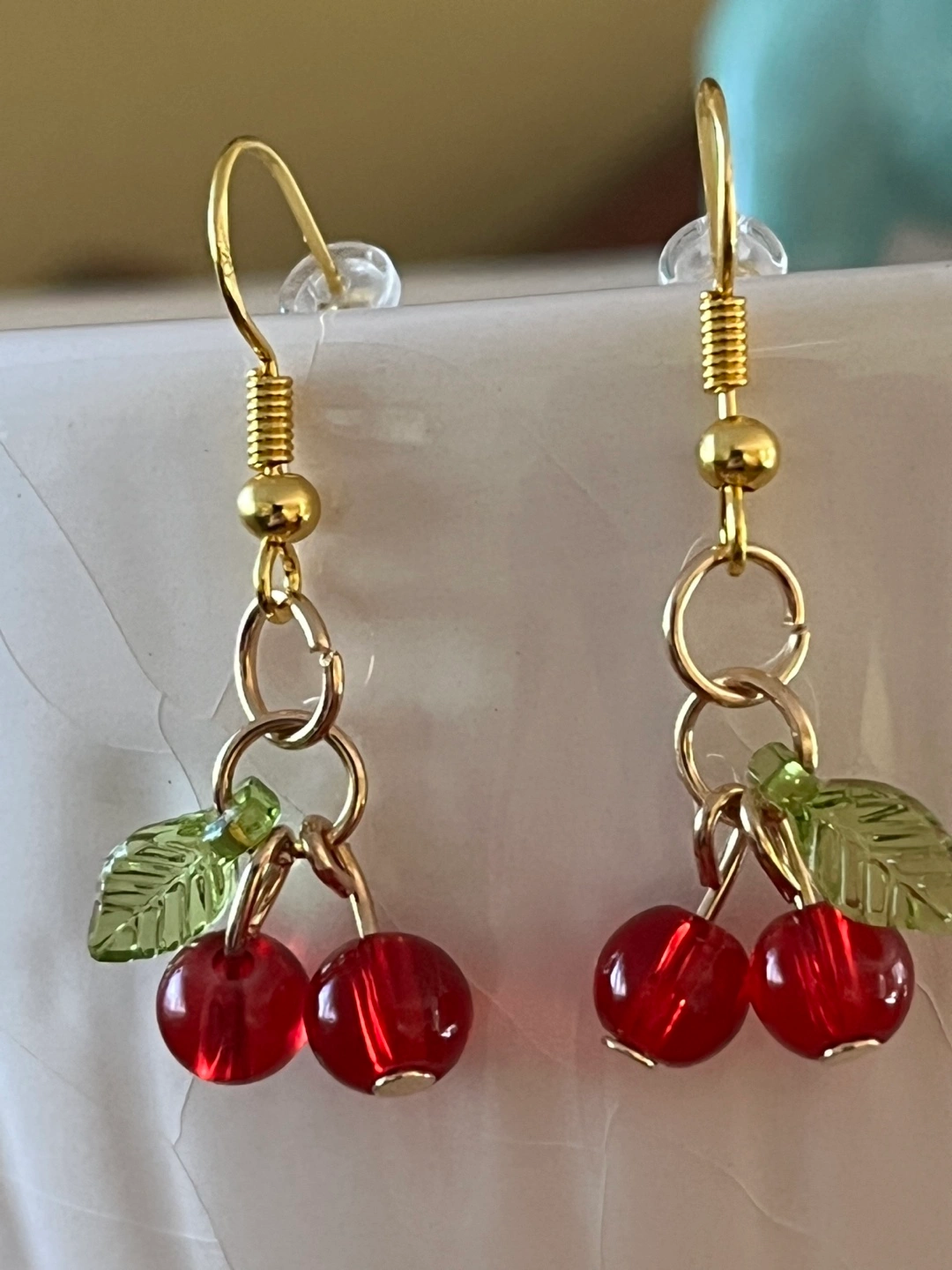 Red glass bead cherry earrings on gold plated sterling silver ear hooks. Hand assembled, new and never worn.