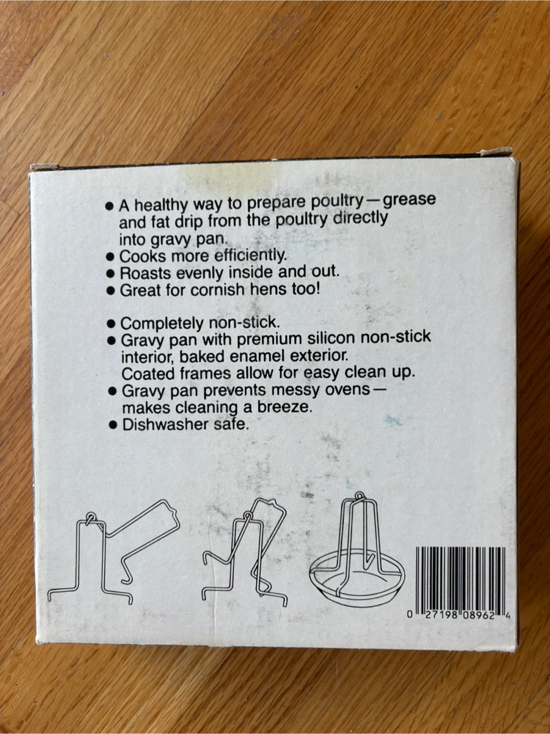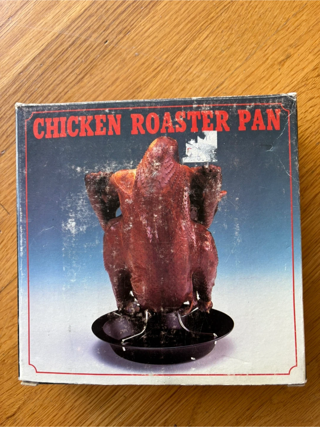 Chicken roaster pan in great condition! It's a healthy way to prepare poultry, as grease and fat drip directly into the gravy pan. - Cooks more efficiently - Roasts evenly inside and out - Great for cornish hens too - Completely non-stick interior, baked enamel exterior - Coated frames allow for easy clean up - Gravy pan prevents messy ovens and makes cleaning a breeze - Dishwasher safe