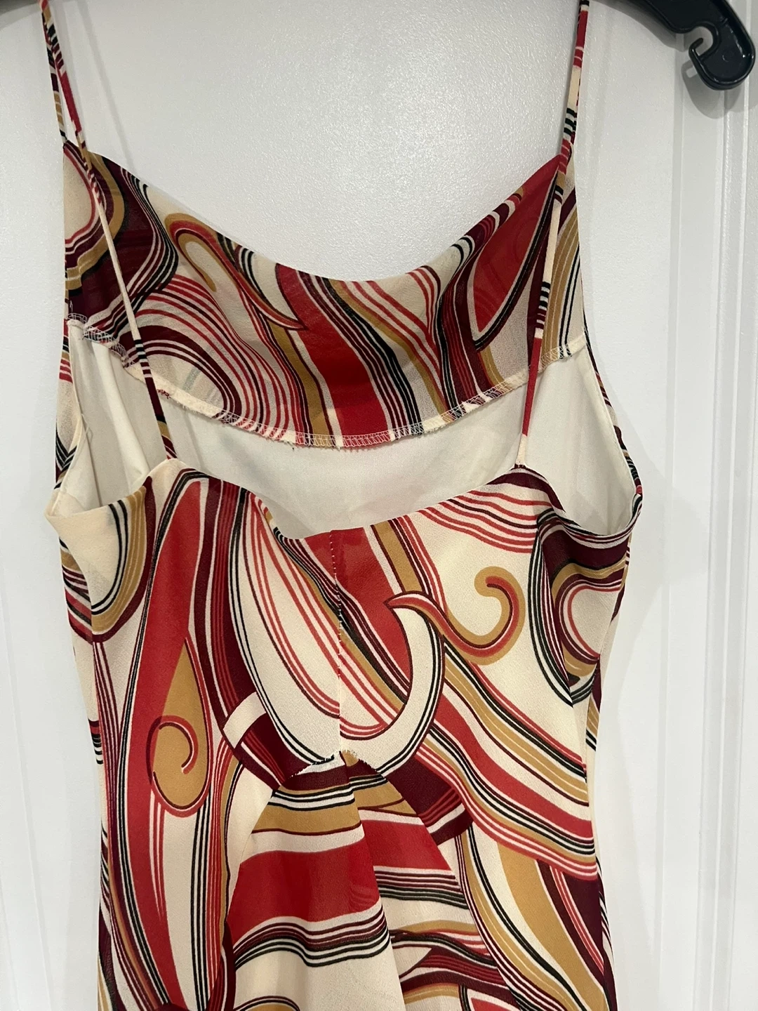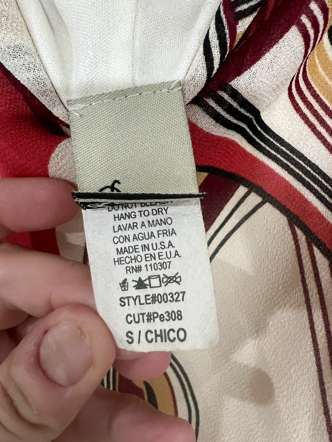 Here's a cute dress from Chico's in size small. It has a fun swirl pattern with red, brown, and cream colours. The style number is 00327 and the cut number is Pe308. It's made in the USA!