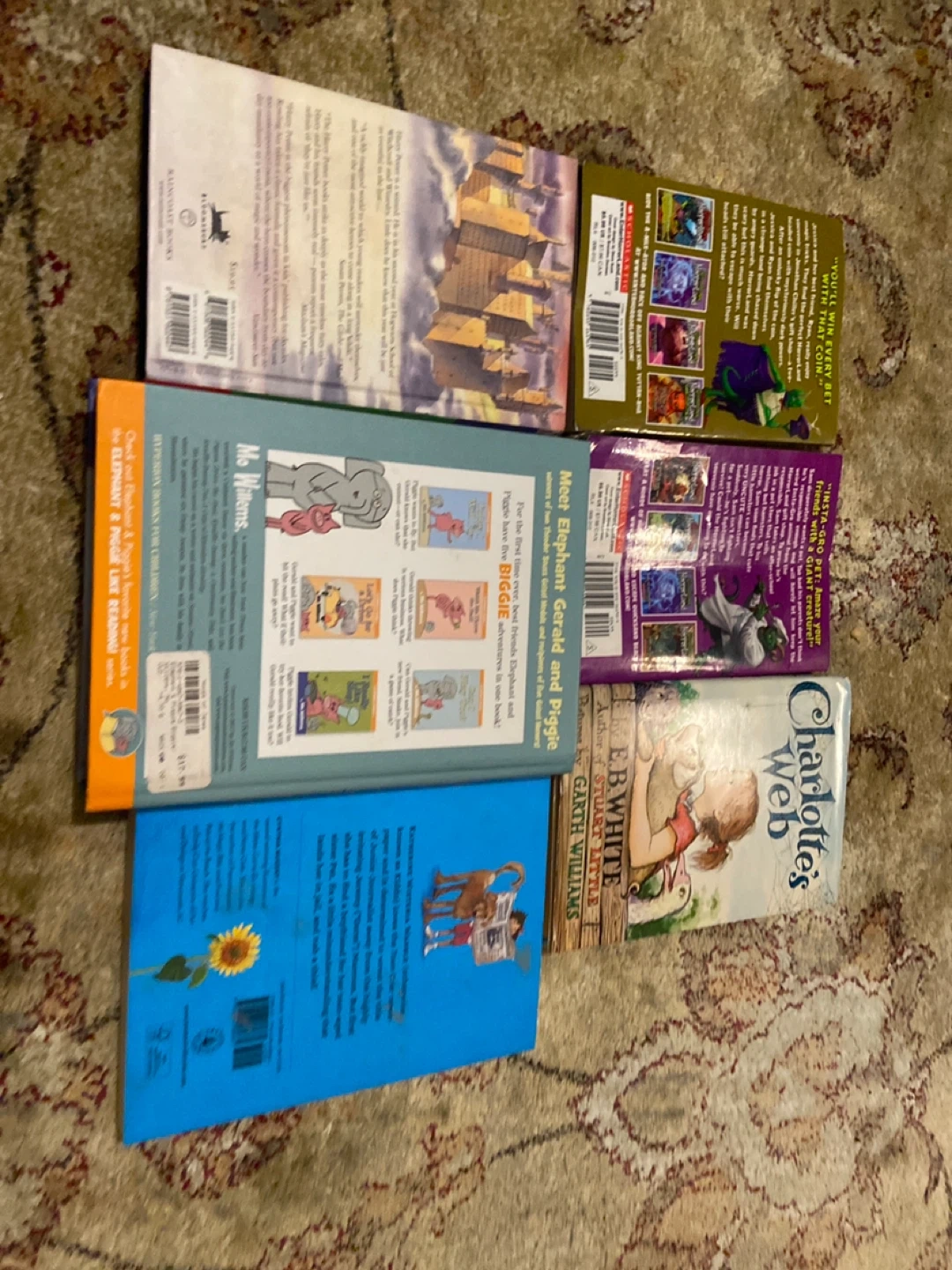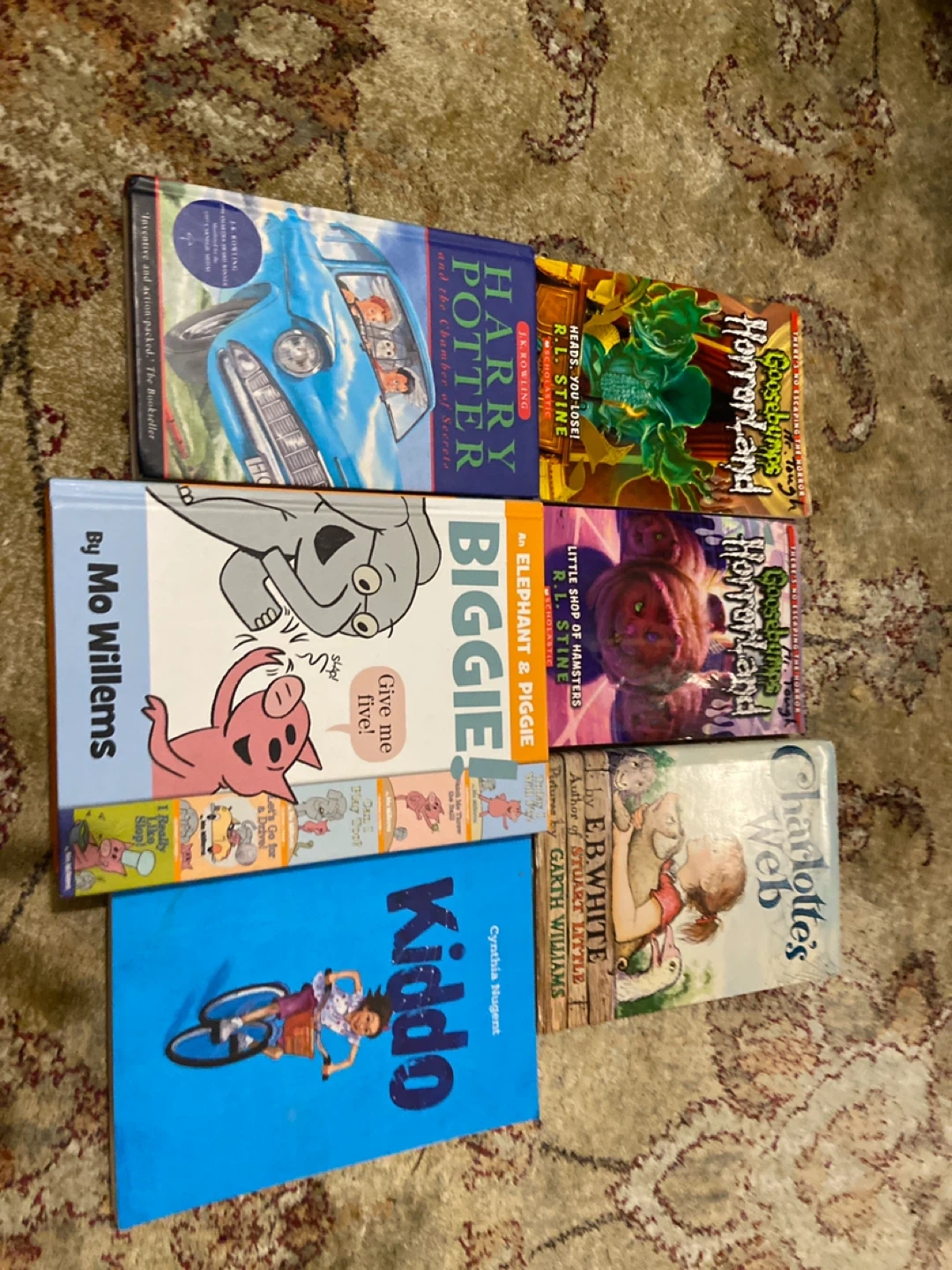 Selling a collection of children's books in good condition. Included are: - Harry Potter and the Chamber of Secrets by J.K. Rowling - Goosebumps Horrorland: Help! We're Trapped in Horrorland! - An Elephant & Piggie Book: BIGGIE by Mo Willems - An Elephant & Piggie Book: LITTLE SQUIRREL IS NOT SCARY by Mo Willems - Goosebumps Horrorland: Escape from Horrorland - Charlotte's Web by E.B. White with Garth Williams - Kiddo by Cynthia Nugent