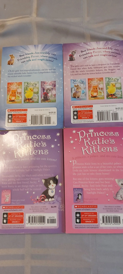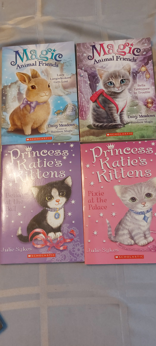 This set includes 2 Magic Animal Friends books and 2 Princess Katie's Kittens books. All books are in Scholastic paperback format. Adorable stories for your animal lovers. Reading level - Appeals to grade 2 to 3 at grade 3 reading level. Sold separately asking $3 or as a group for $10 for all 4. Magic Animal Friends - Lucy Longwhiskers Get Lost Magic Animal Friends - Bella Tabbypaw in trouble. Princess Katie's Kittens - Bella at the Ball Princess Katie's Kittens - Pixie at the Palace