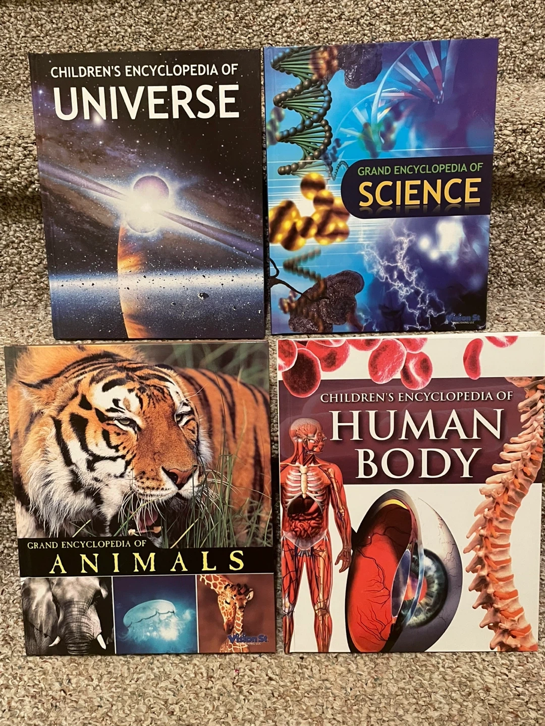 Selling a set ($40 set) of four children's encyclopedias: Universe, Grand Encyclopedia of Science, Grand Encyclopedia of Animals, and Children's Encyclopedia of Human Body Each ($15 each) book is packed with information and illustrations, making learning fun and easy for kids
