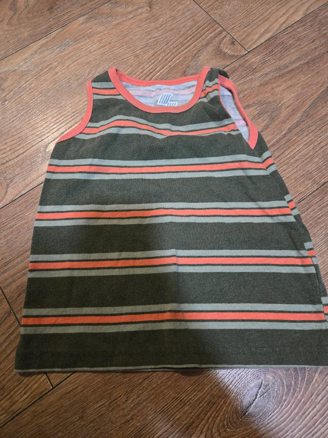 Here's a cute striped tank top from The Children's Place! It features a green base with orange and grey stripes. Perfect for summer! size 18 to 24m