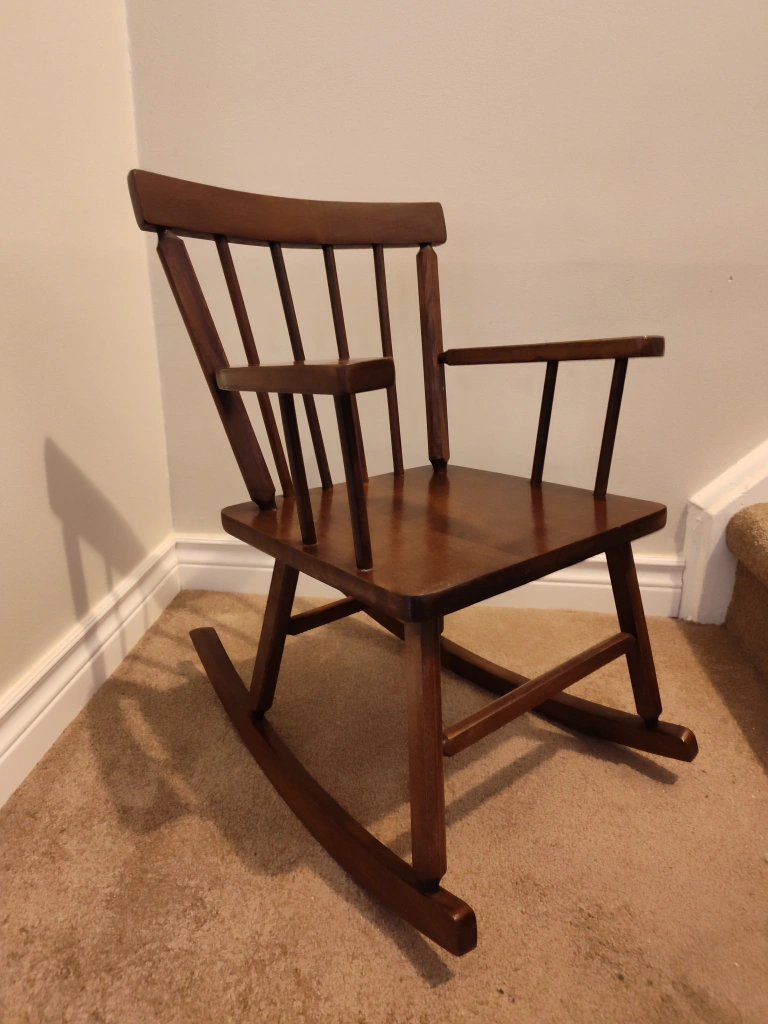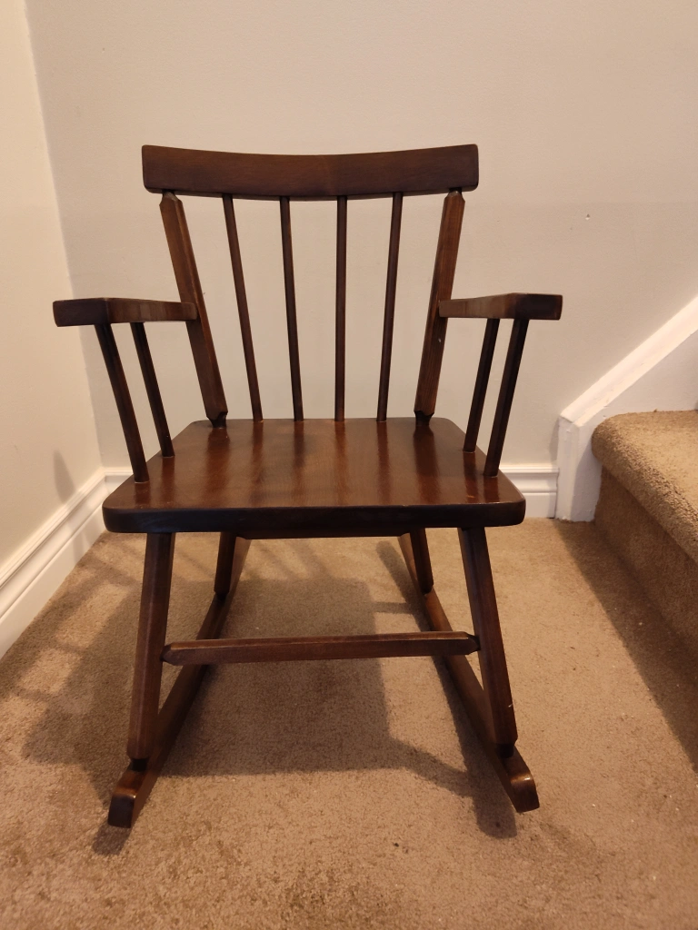 Child's vintage wooden rocking chair in dark brown. Solid wood. The chair is in good condition and ready for a new home! cash only, p/u Streetsville
