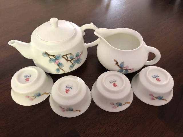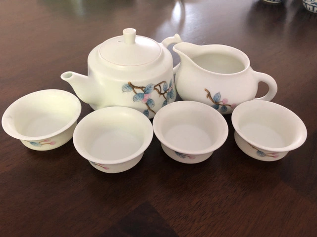 This is a used Chinese tea set, perfect for tea enthusiasts. The set includes a teapot, a creamer, and five cups, all decorated with delicate floral designs. The condition is good, with no chips or cracks. It's a charming addition to any tea collection. While I adore this tea set, it's time for it to find a new home! If the ad is up, the tea set is available, so don't hesitate to reach out. I'm pricing it at $30 to reflect its condition and completeness.