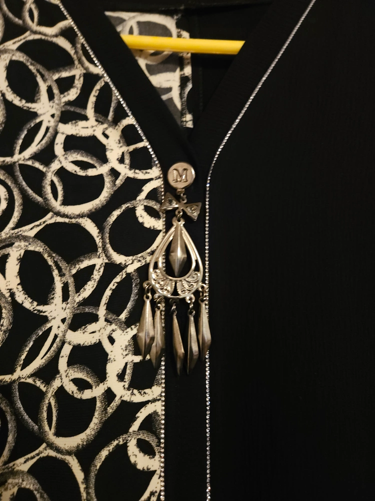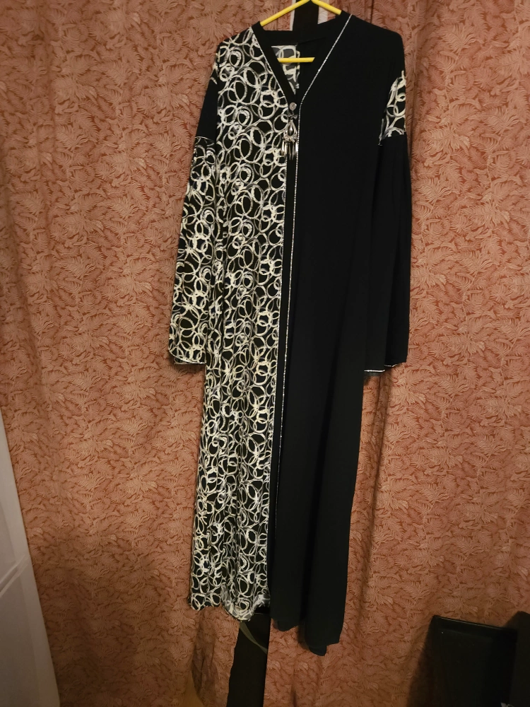 Selling a fashionable abaya with a unique chocolate and cream pattern along with miniature rhinestones/sparles. It's in great condition and worn only twice. Material flows while walking and does not wrinkle. Relocating and must be sold to a good home.