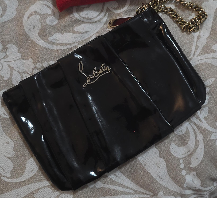 Selling a beautiful Christian Louboutin clutch in black patent leather! It features a gold chain strap and comes with its original dust bag. Perfect for a night out or special occasion