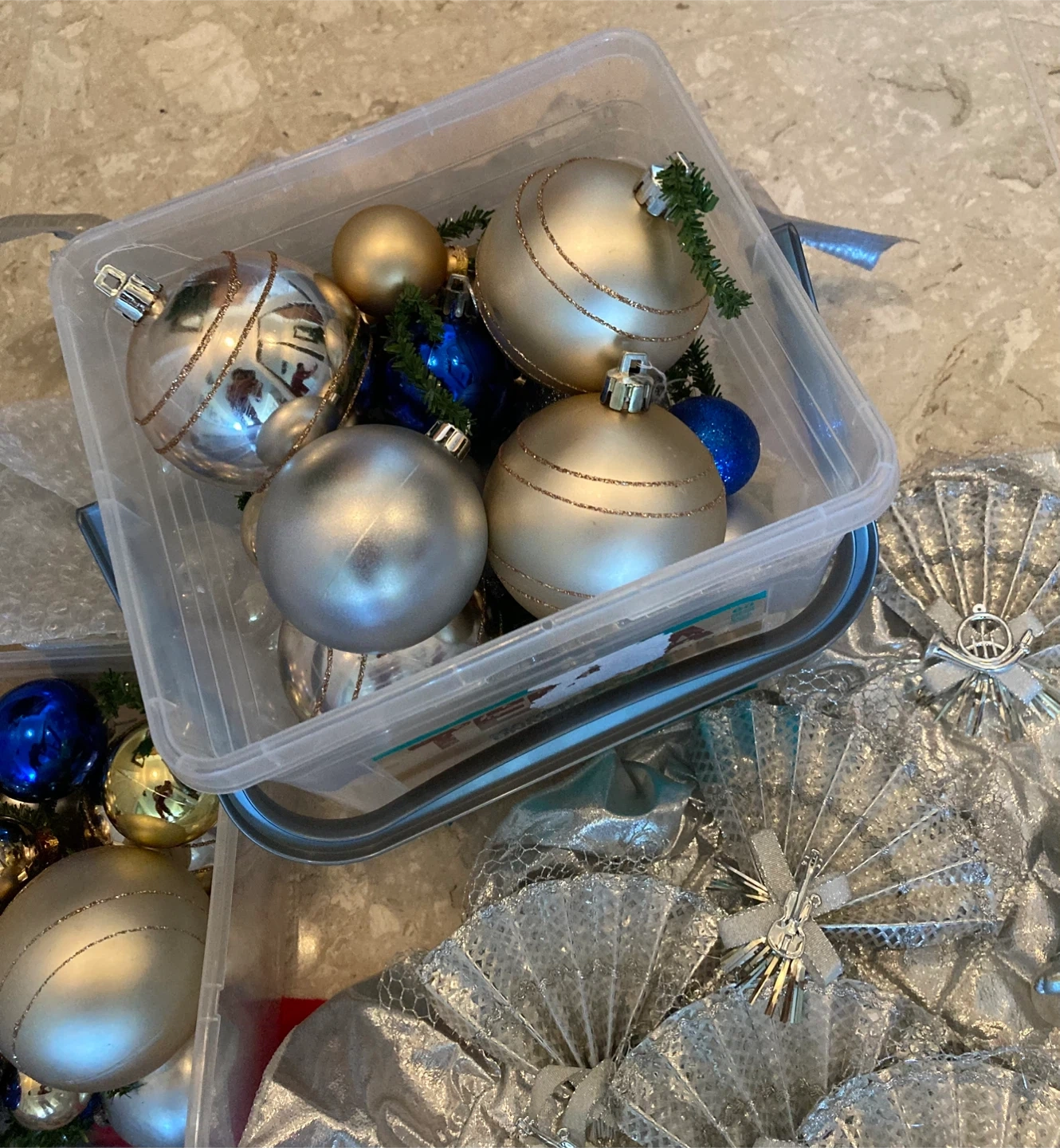 Selling a collection of silver gold Christmas ornaments in various finishes, including silver, gold, and blue. Also included is a silver tree skirt. Great for decorating your home for the holidays!