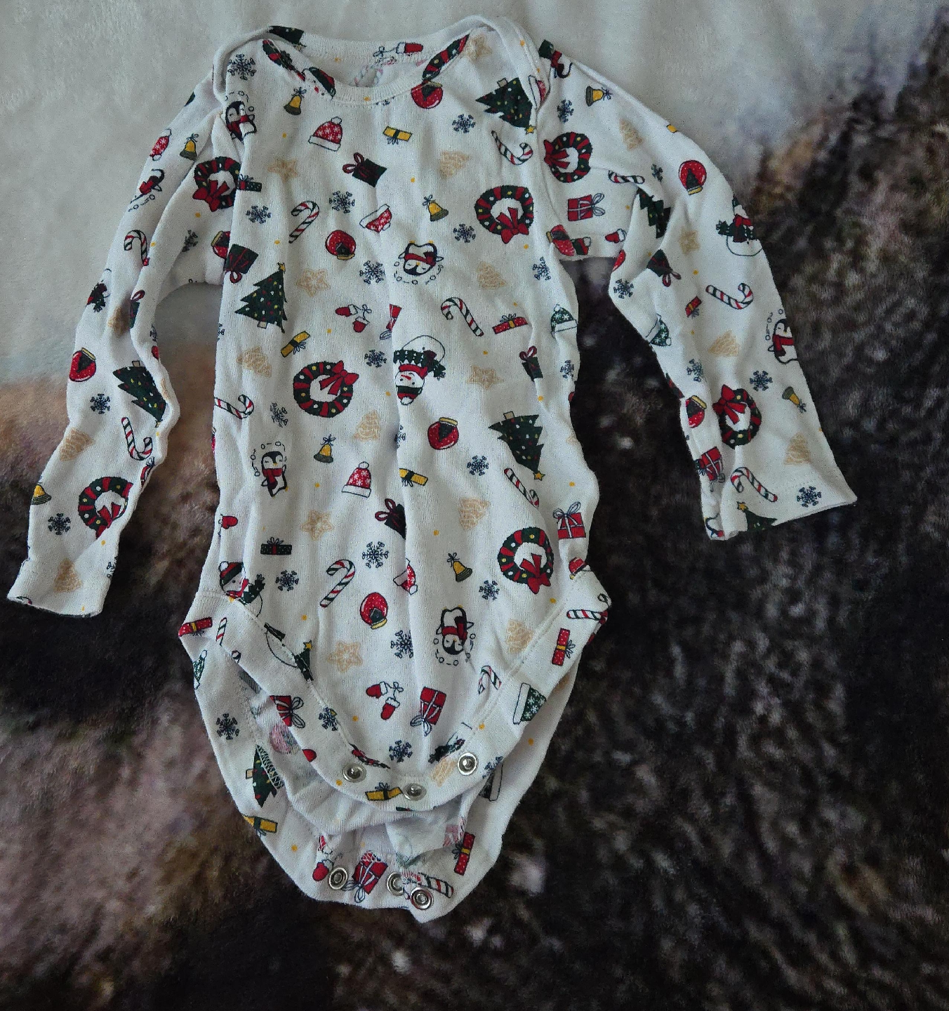 A cute baby onesie with a festive Christmas pattern featuring trees, wreaths, and candy canes! Perfect for the holiday season.