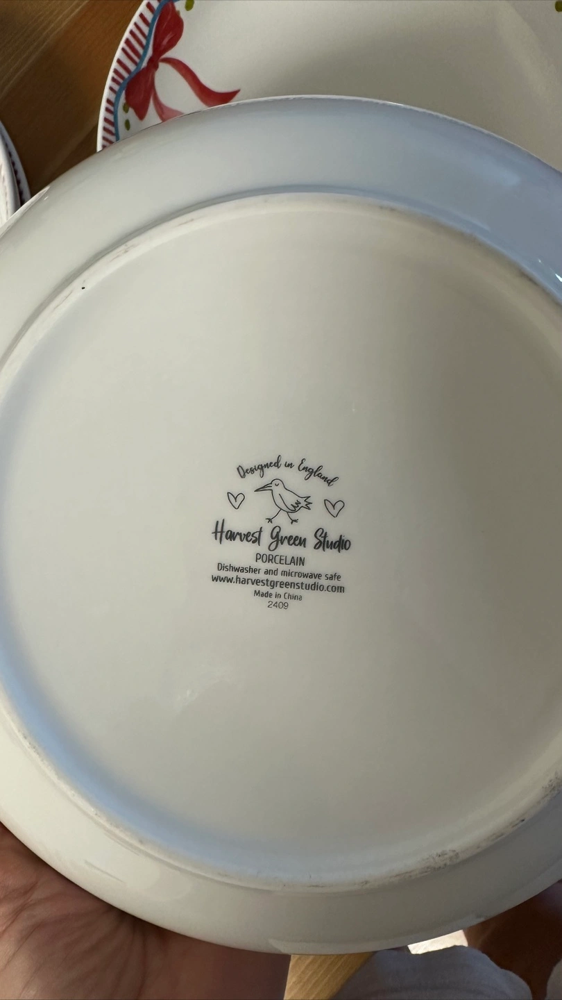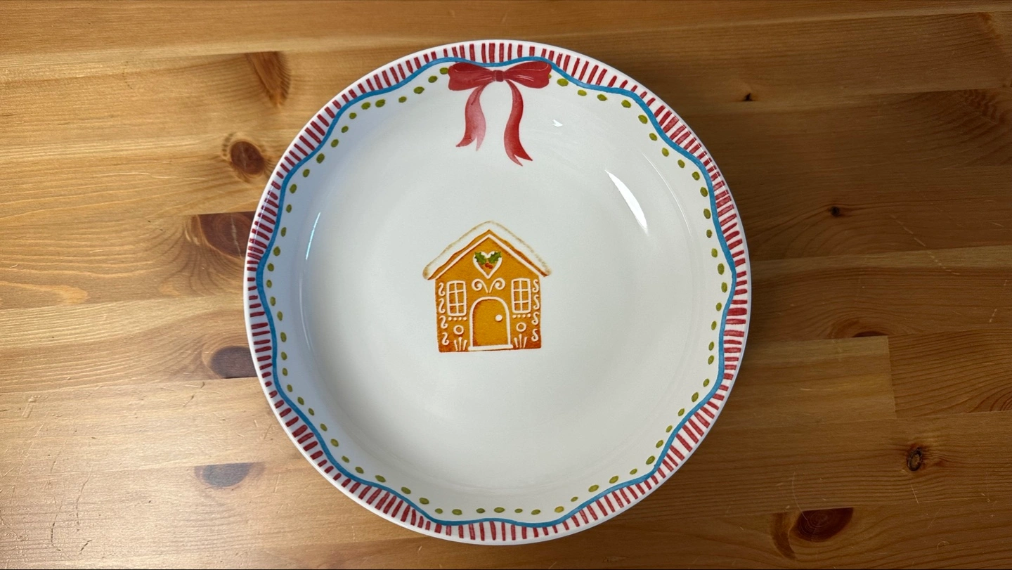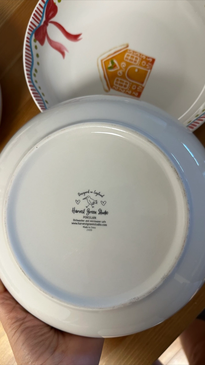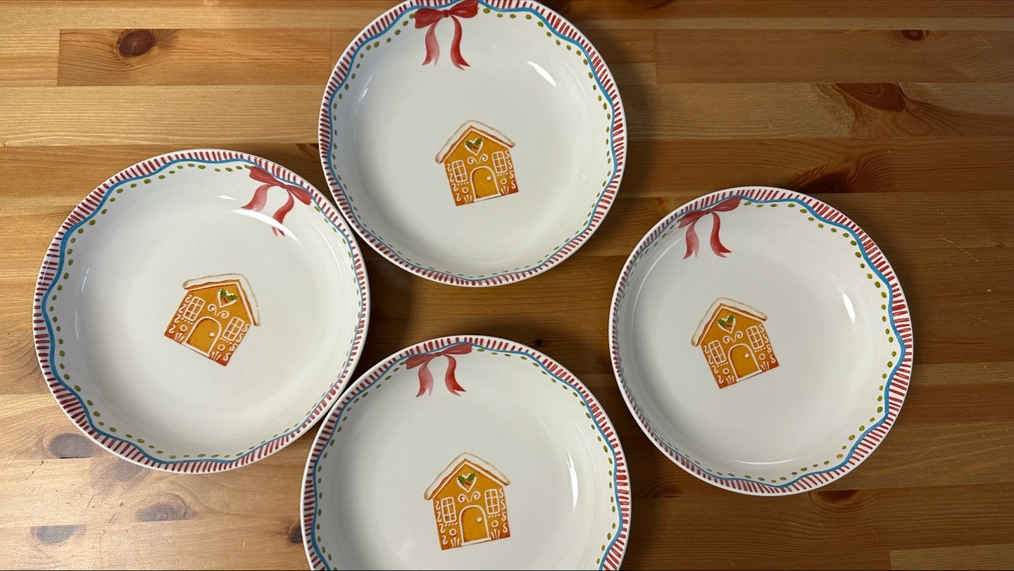 Selling a set of four adorable porcelain bowls from Harvest Green Studio! They're designed in England and feature a cute gingerbread house design with a red ribbon detail. These bowls are both dishwasher and microwave safe, making them perfect for everyday use or festive occasions