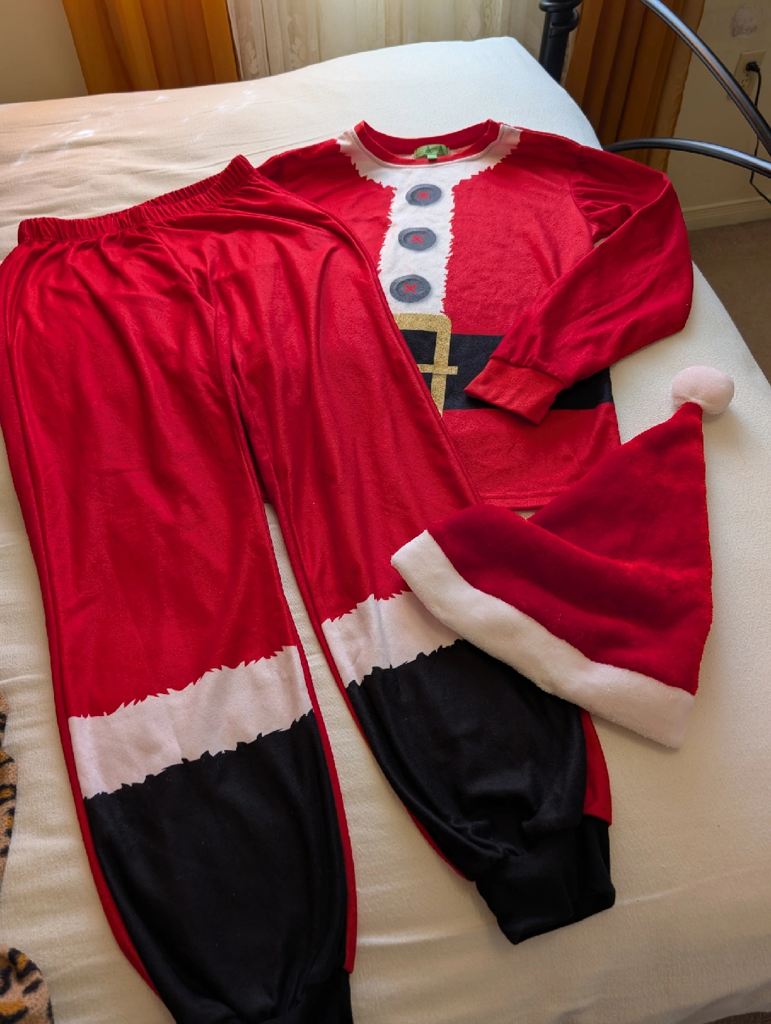 Get ready for the holidays with this adorable Christmas Santa pajama set! It includes a long-sleeved top, pants, and a Santa hat, perfect for getting into the festive spirit. The size is S/P, so it's ideal for smaller frames. Spread some holiday cheer!