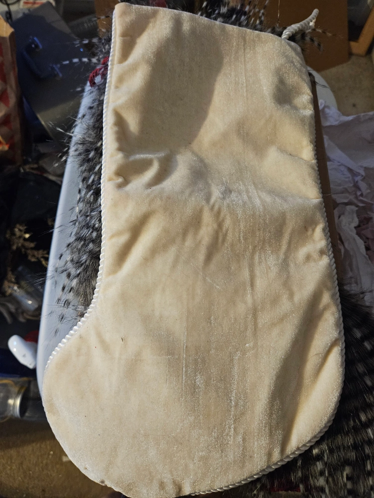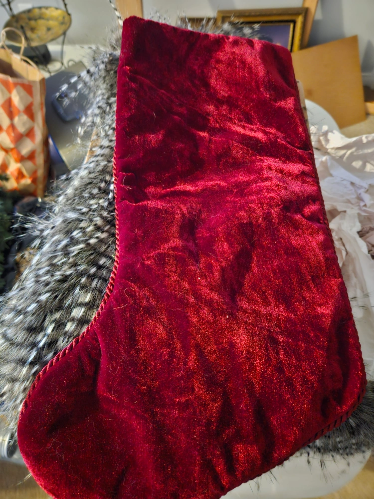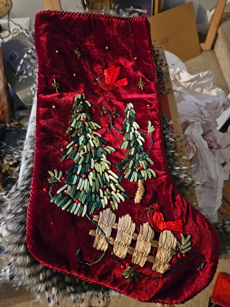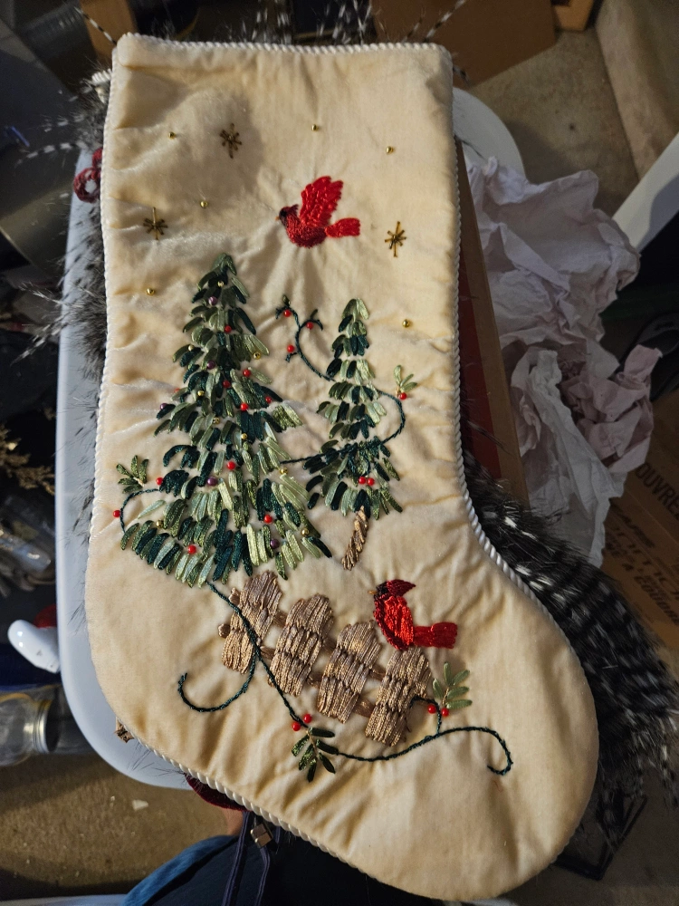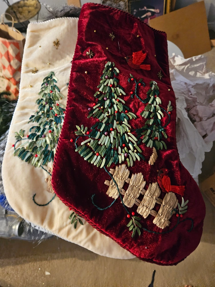 Two Christmas stockings for sale! One is a deep red velvet and the other is a velvety cream. Both have embroidered details of Christmas trees, cardinals, and fences. Perfect for adding a cozy touch to your holiday decor.