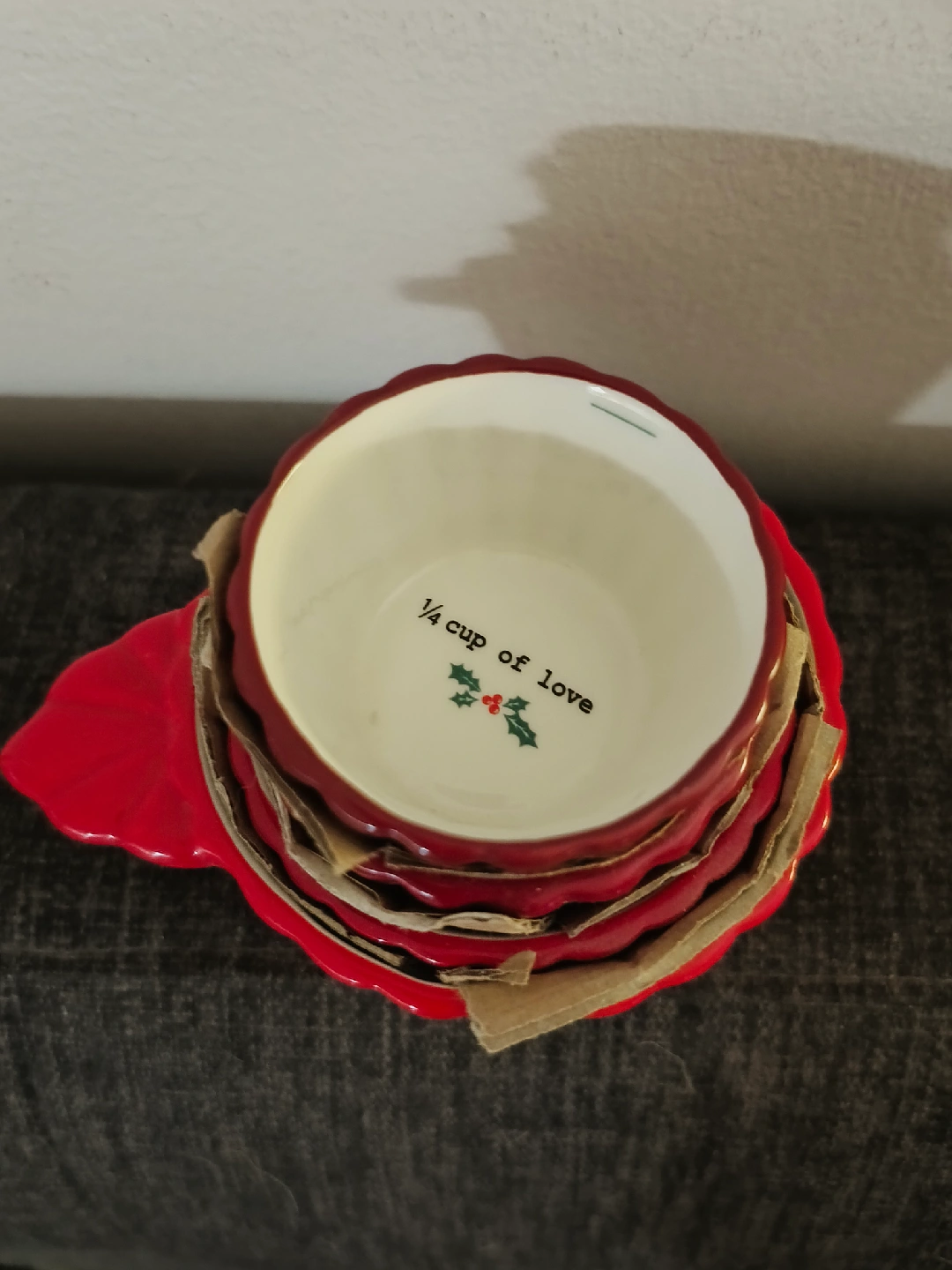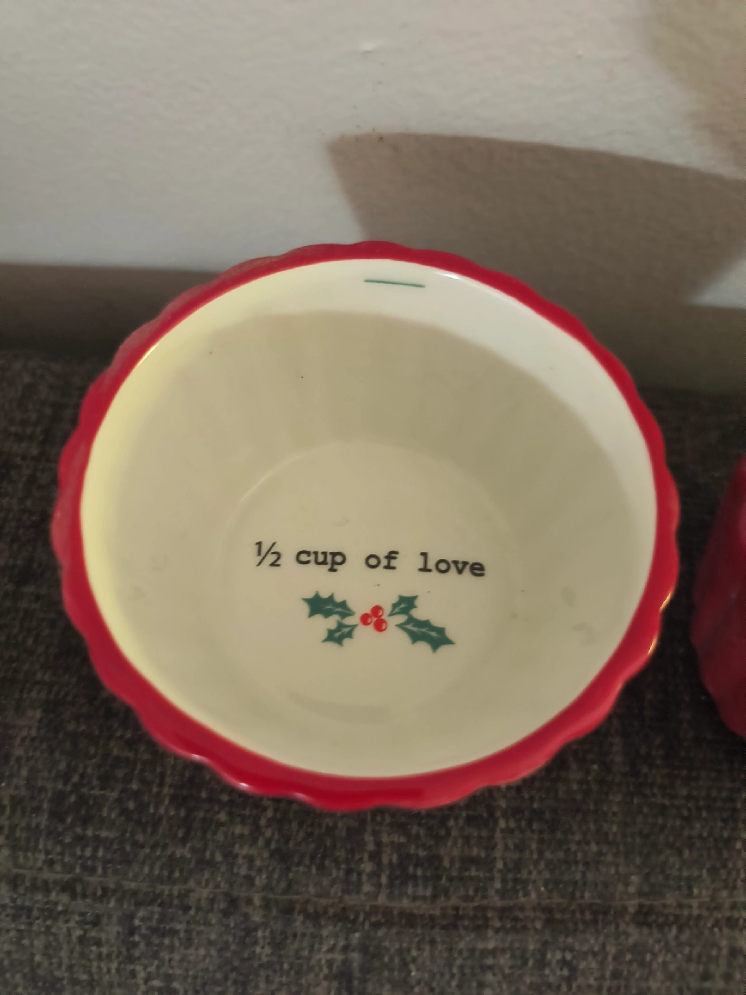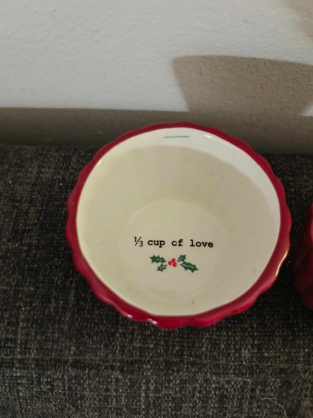 Selling a set of 4 Christmas Theme measuring cups. They are red and white with "1/4 cup of love", "1/3 cup of love", "1/2 cup of love" and "1 cup of love" written inside. Perfect for baking!