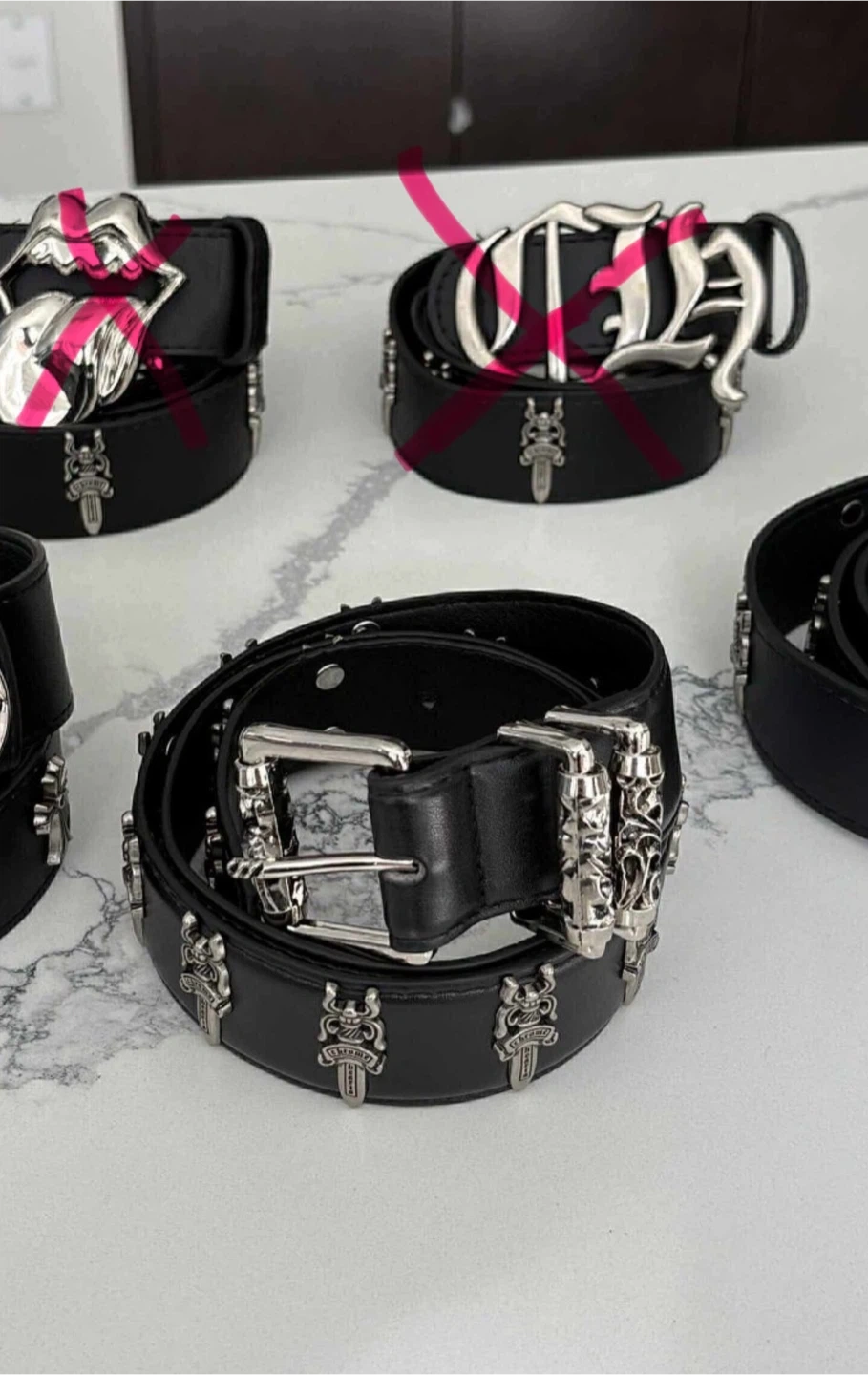 Selling a Chrome Hearts black leather belt. It features a silver buckle and silver detailing around the belt. A stylish accessory to complete any outfit!