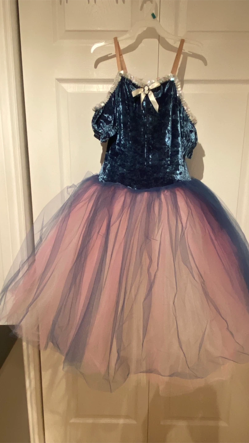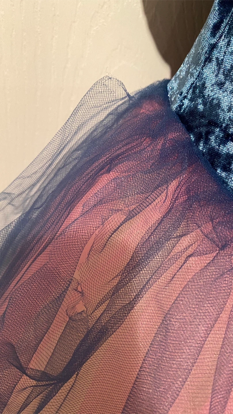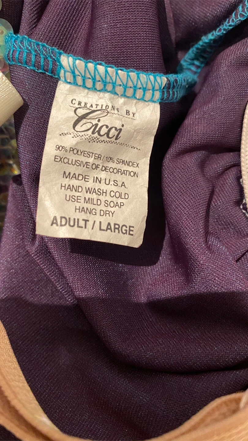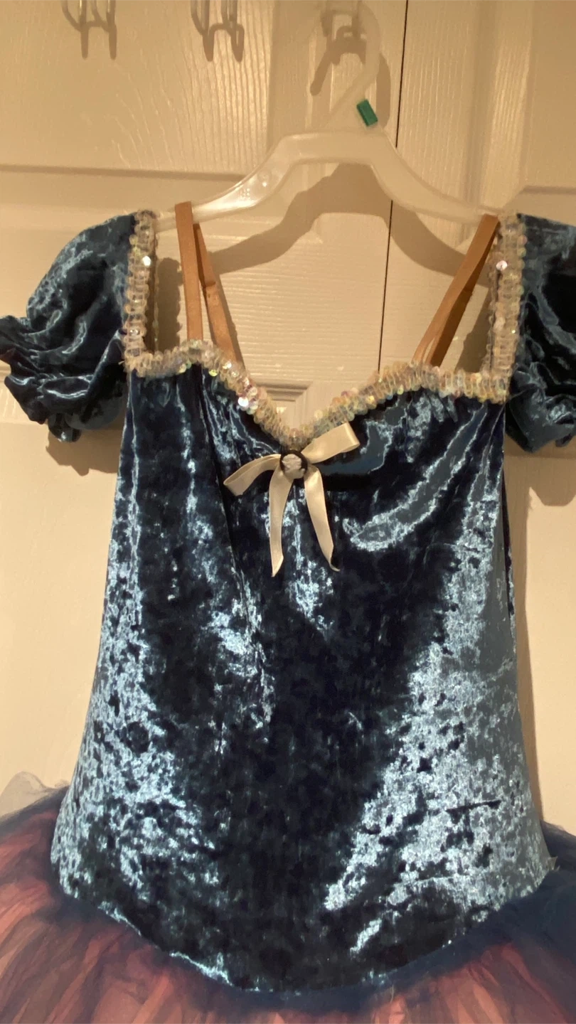 Cicci - Nylon spandex leotard with nylon/velvet spandex front and back bodice. Built in undies. Tulle and net skirt. Excellent condition except for small rip in tulle at seam (last picture).