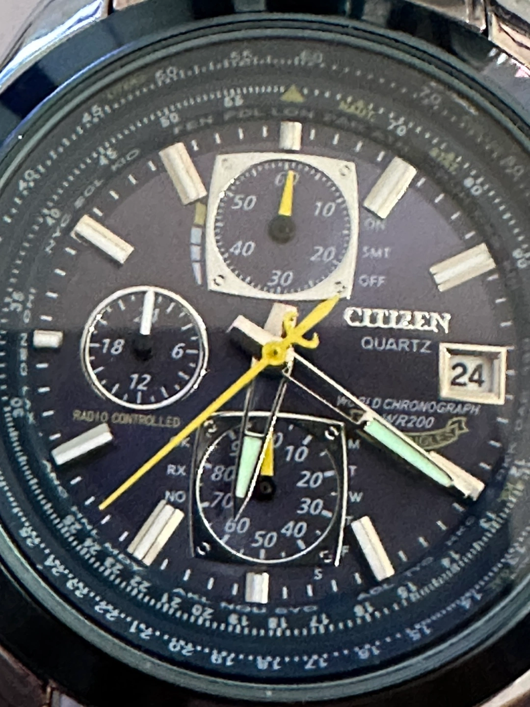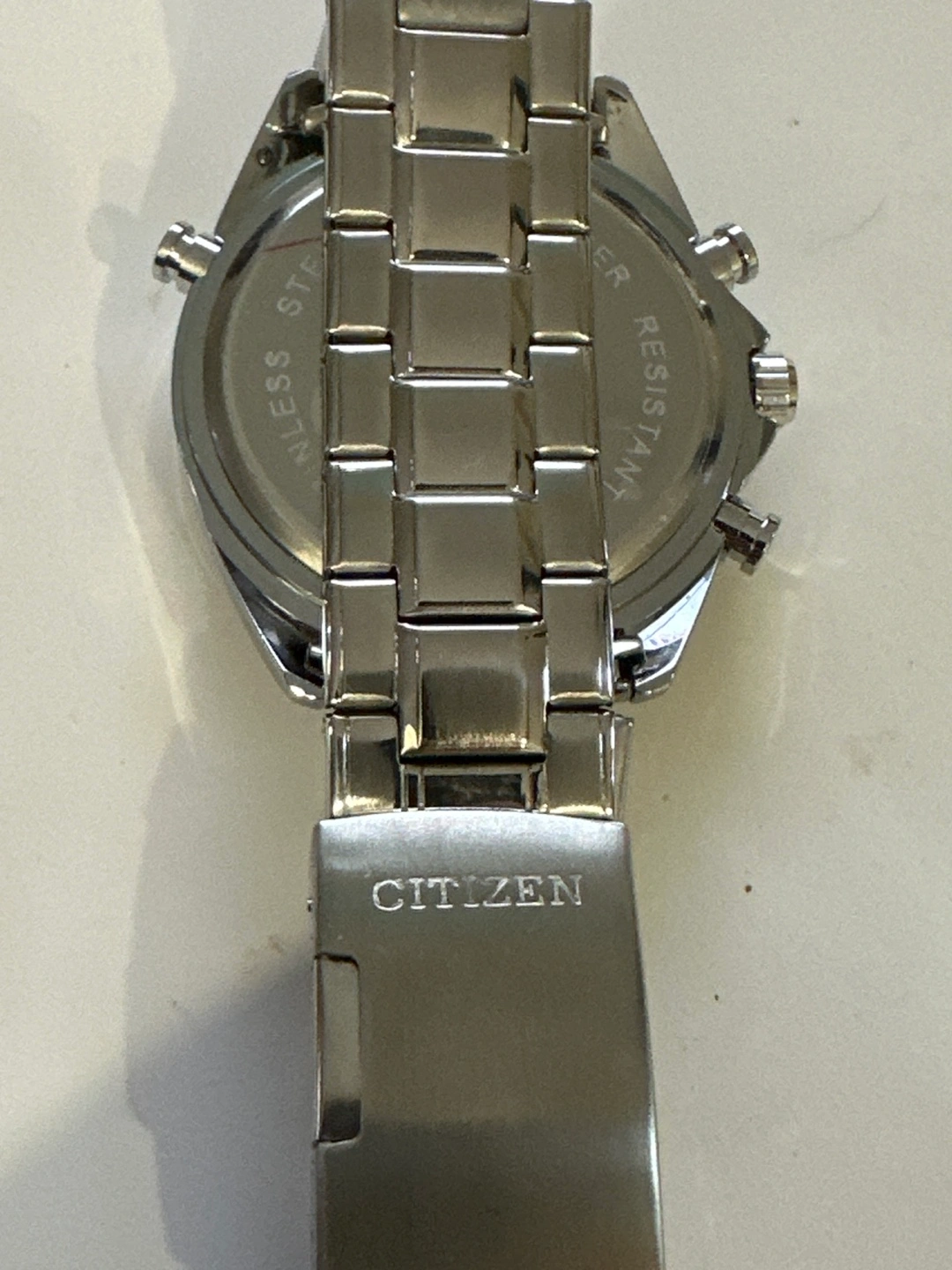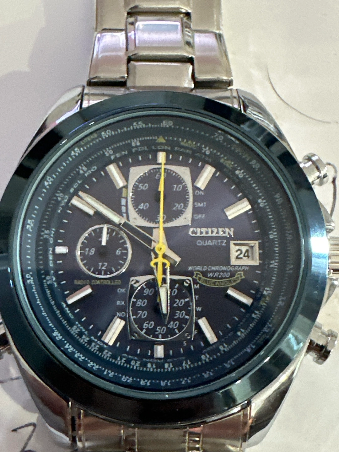 Selling a Citizen Quartz World Chronograph WR200 watch. It features a stainless steel band and a blue face with chronograph functions. It's in good condition and ready for a new wrist!