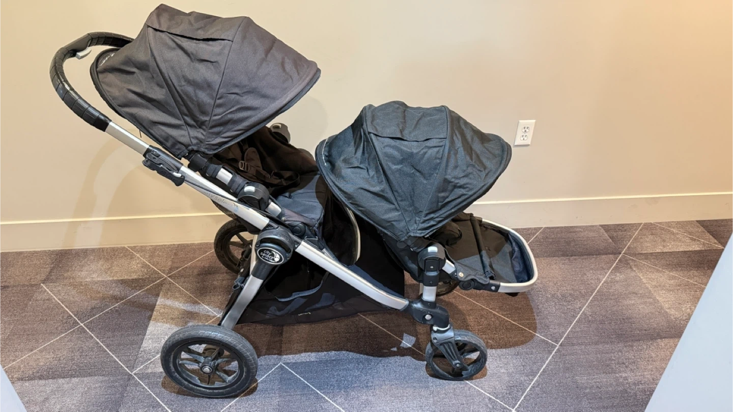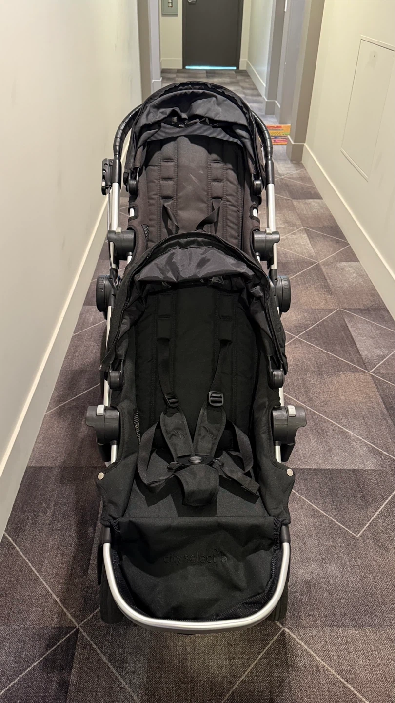 Selling a black City Select double stroller! It's in great condition and ready for a new family. This stroller is super versatile and can be configured in multiple ways to suit your needs. Perfect for growing families! One of seats is missing a lock buckle- this can be used as is or you can purchase it for a cheaper cost.