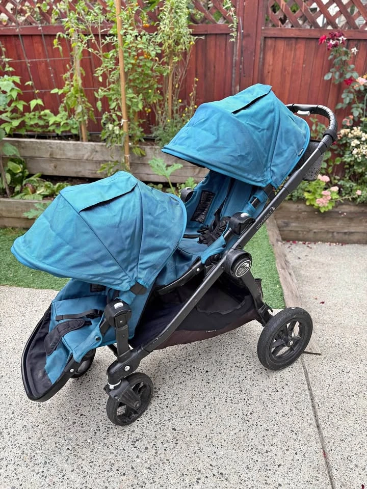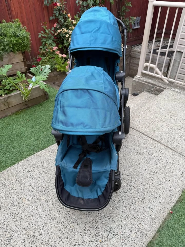 City Select Double stroller in teal. Can face seats in multiple ways, super versatile and great for twins or a growing family. This stroller has served us well and is ready to join another family. The basket underneath on one side has had its attachments come off and have been fixed up otherwise everything is fully functional and in good condition. Parent console included as an extra. PU 80ave near 208st Langley
