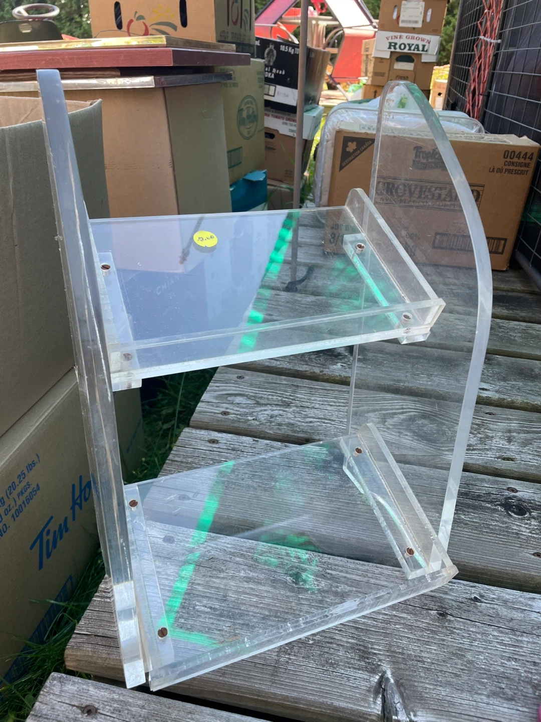 Selling a clear acrylic display shelf. It's in good condition and would be great for displaying items in your home or at a craft fair.
