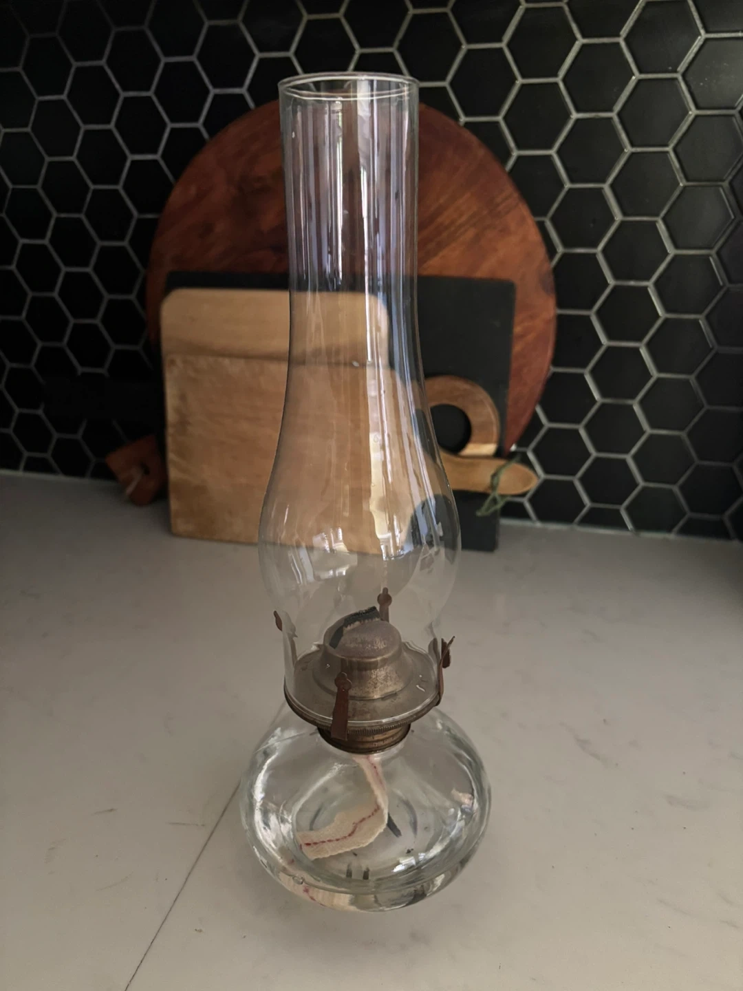 Selling a clear glass oil lamp! It's in good condition and would make a nice decorative piece. Perfect for adding a touch of vintage charm to any room