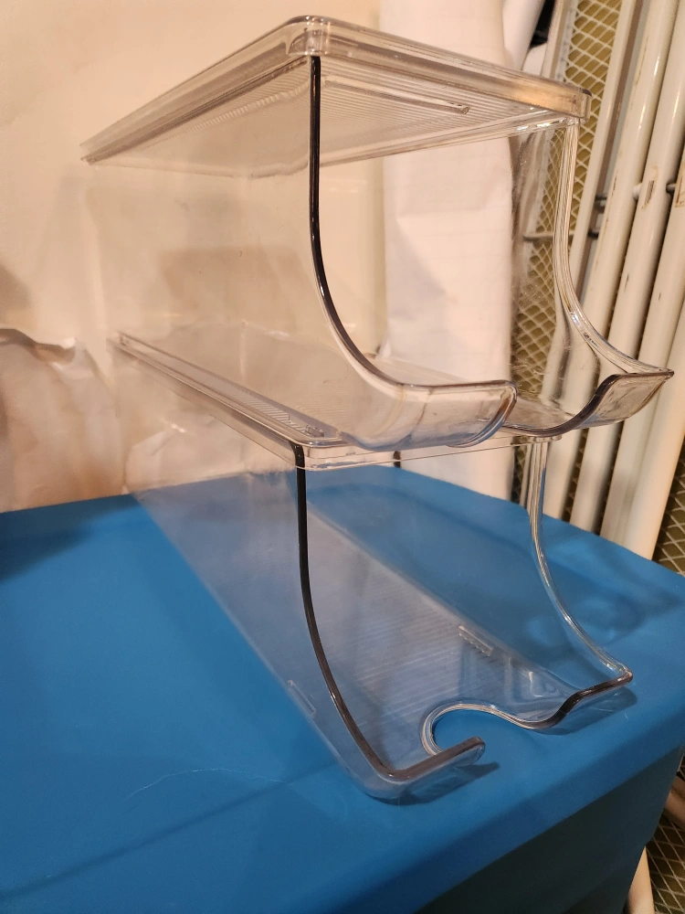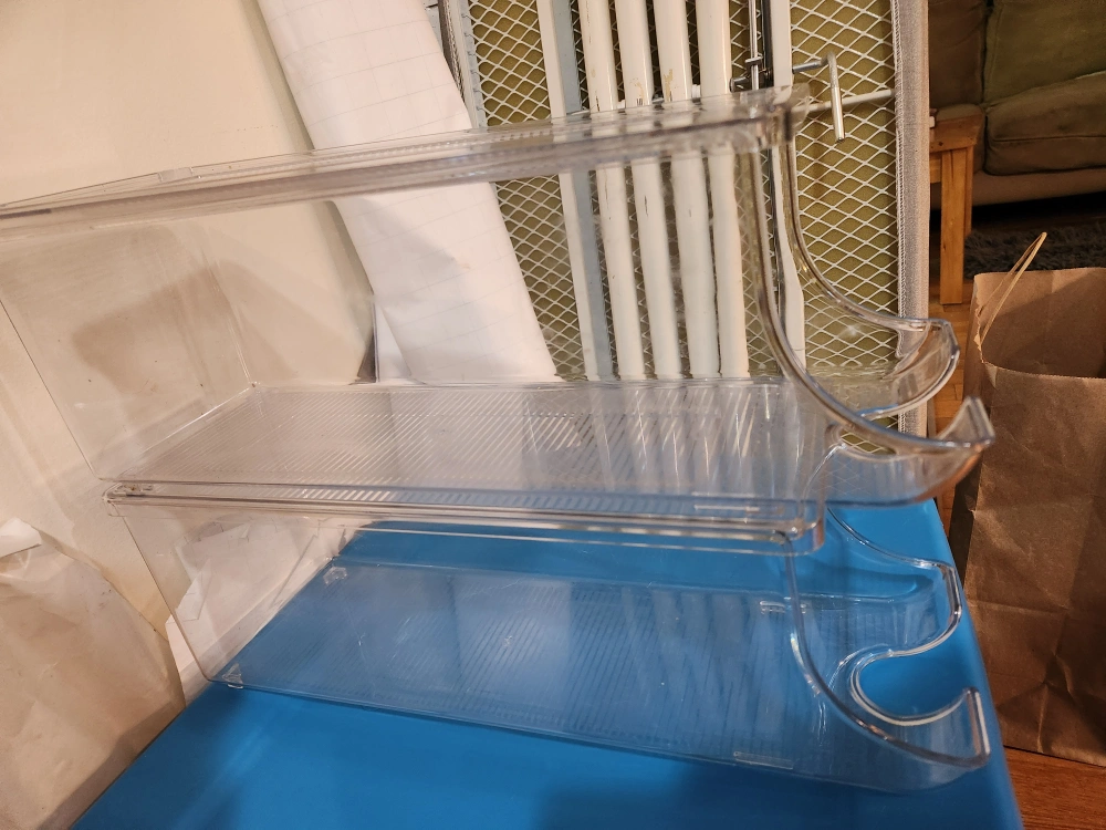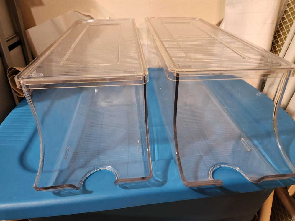 Selling a pair of clear plastic fridge organizers. They're in great shape and ready to help you maximize your fridge space! Each one big enough for holding a 24 can case of pop.