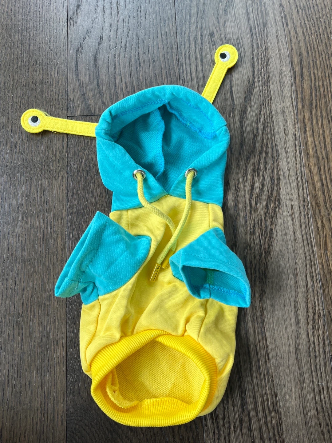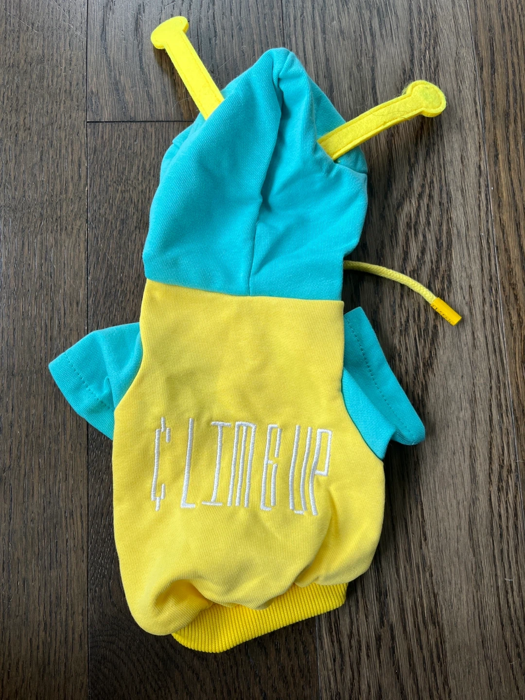 Super cute never used ClimbUp dog hoodie in yellow and blue! It's in great condition and ready for a new furry friend. Perfect for keeping your pup warm and stylish on those cooler days Length from neck: 7.5 inches Circumference: 11 inches