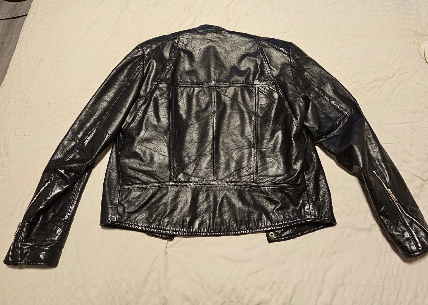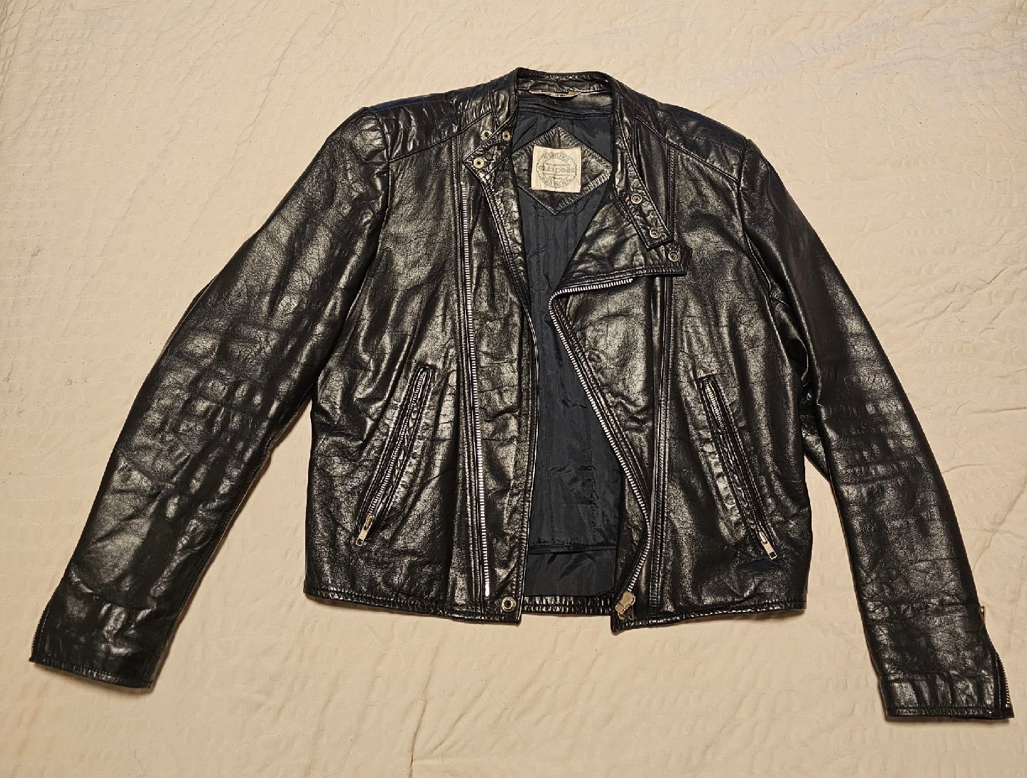 100% genuine leather jacket from the 1980s. Brand: Club Pelle Size: Men’s Medium Condition: No cracking or rips, just natural creasing from wear, in excellent condition Classic biker style with asymmetrical front zipper and zip cuffs. Vintage piece, well cared for.