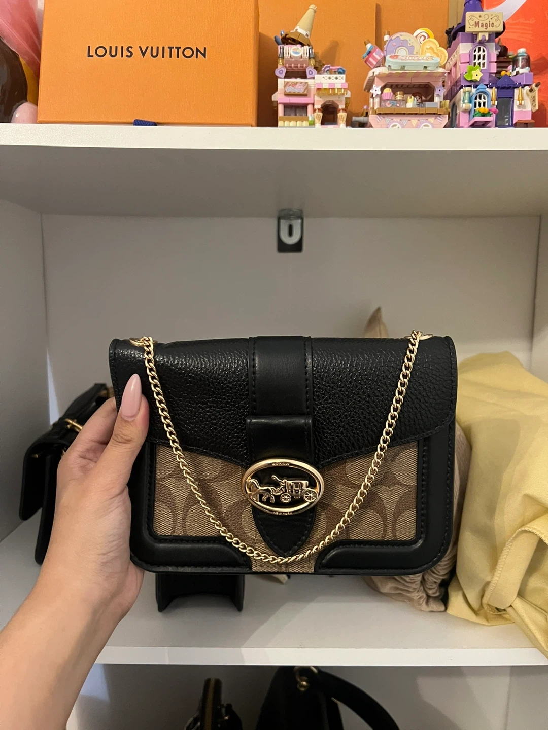 Selling a Coach shoulder bag in a stylish black and brown signature print! The bag features a gold chain strap and the classic Coach logo. It's in great condition and perfect for adding a touch of elegance to any outfit