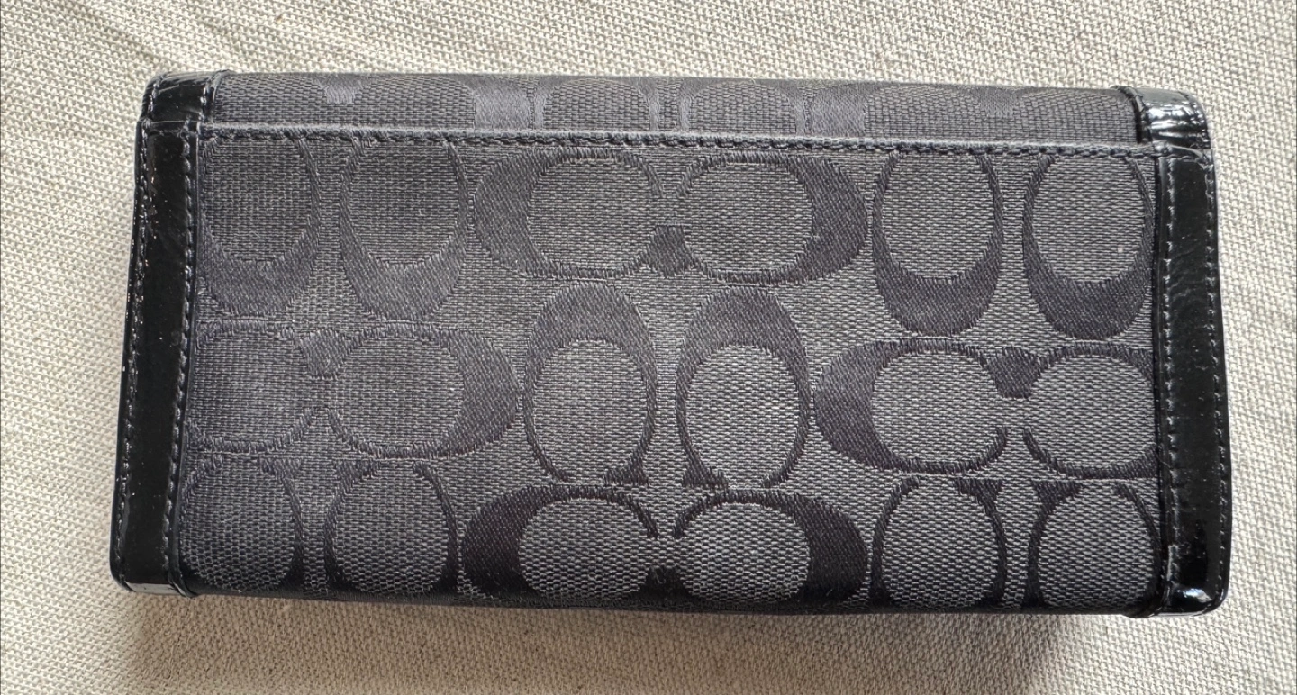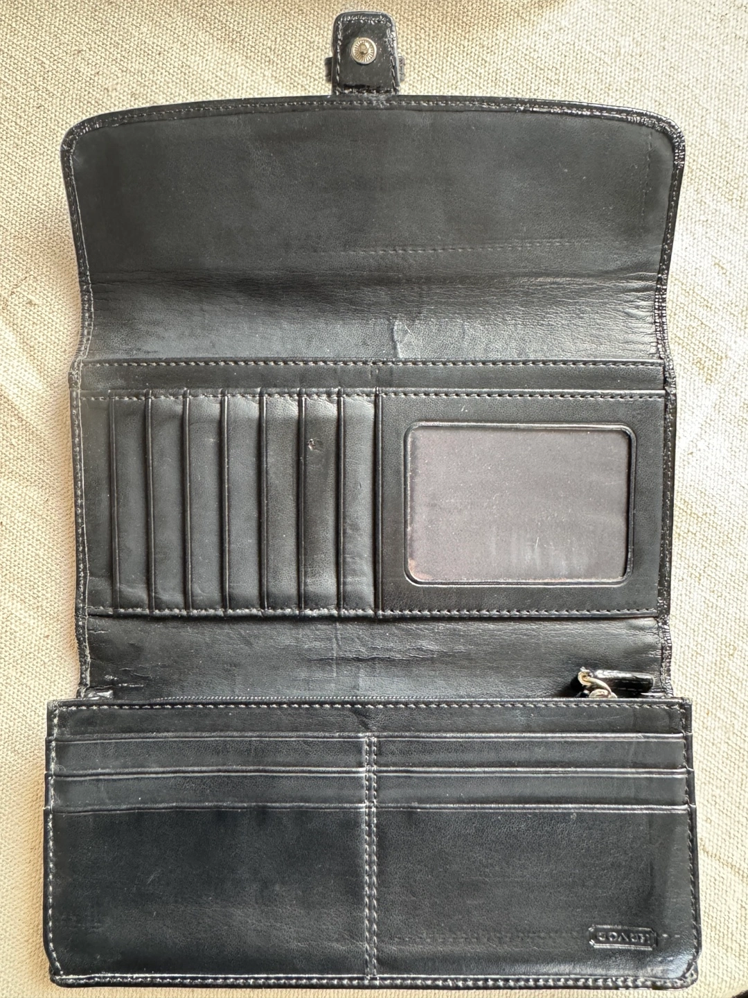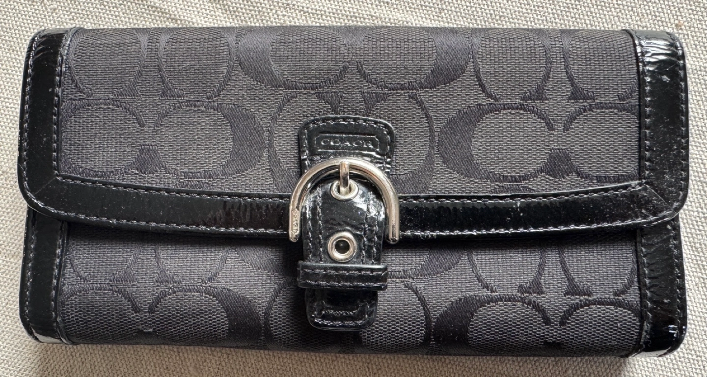Selling a Coach wallet in black signature canvas. It features a buckle closure and plenty of slots for cards and cash. It’s in good used condition and ready for a new home!