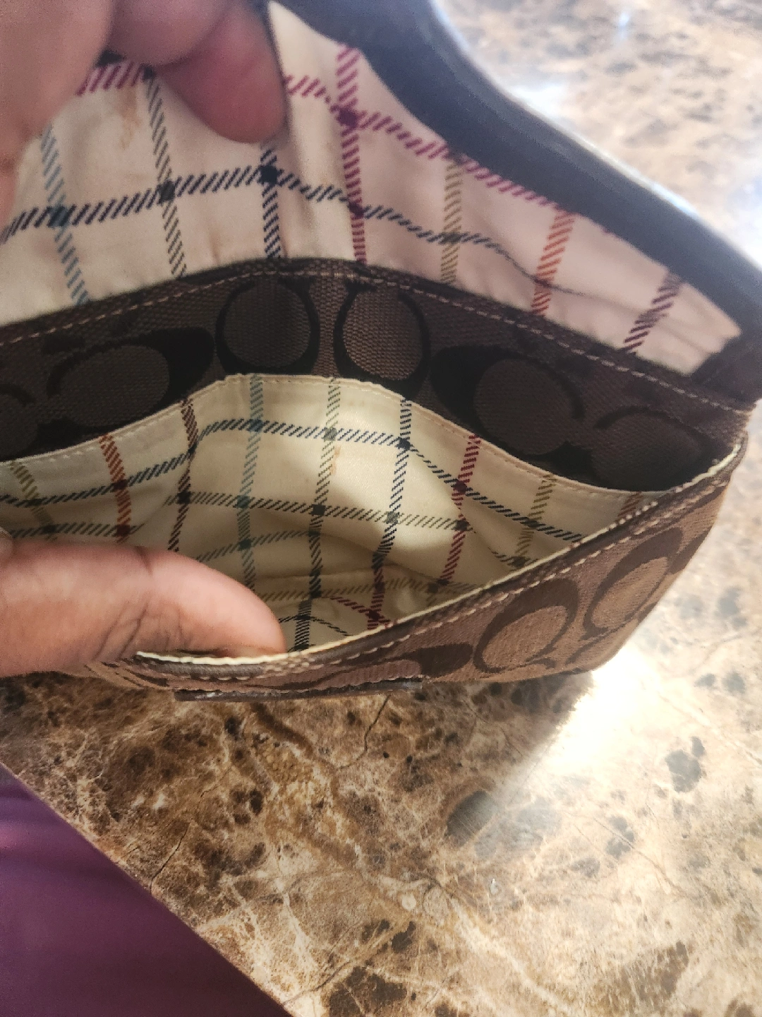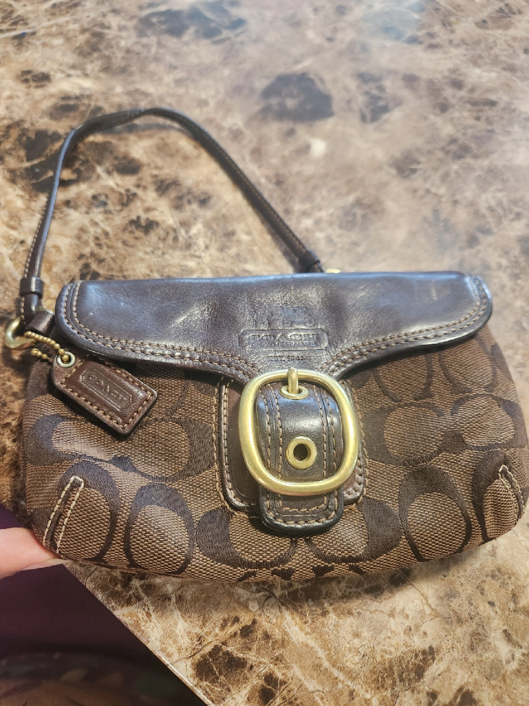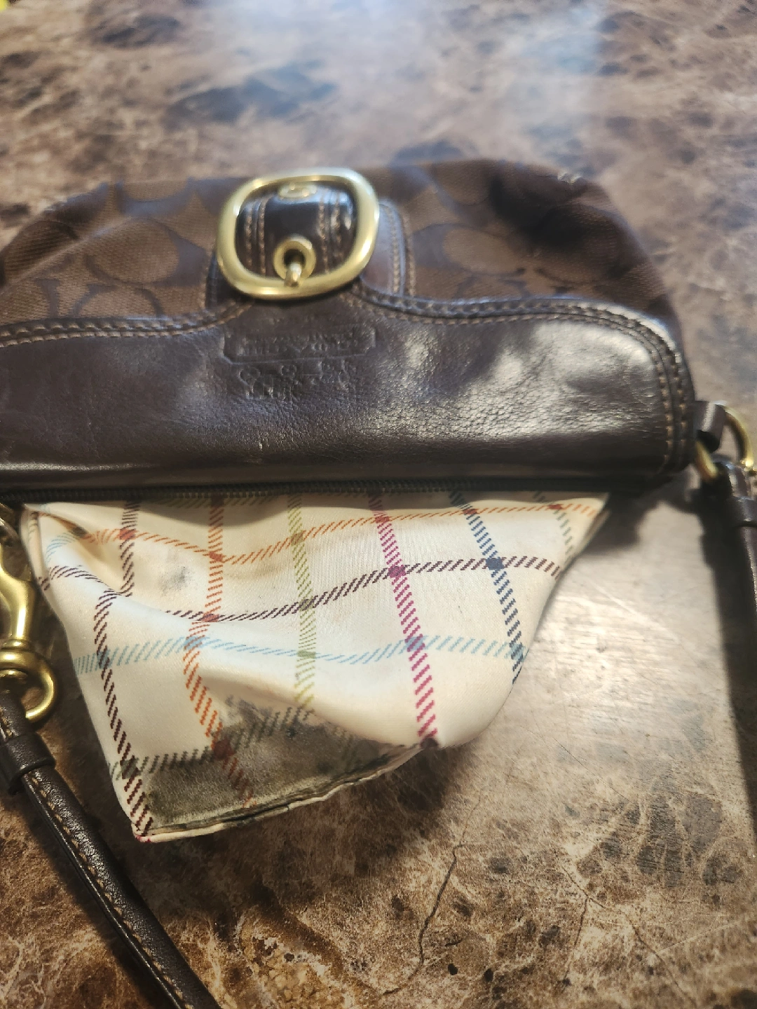 Selling a cute Coach mini baguette bag in brown signature print! It's perfect for a night out or when you just want to carry the essentials. The interior has a fun plaid pattern. It's in good used condition. price is firm plz. pick up midland and Danforth or 401 bay street or stc mall or Kennedy stn