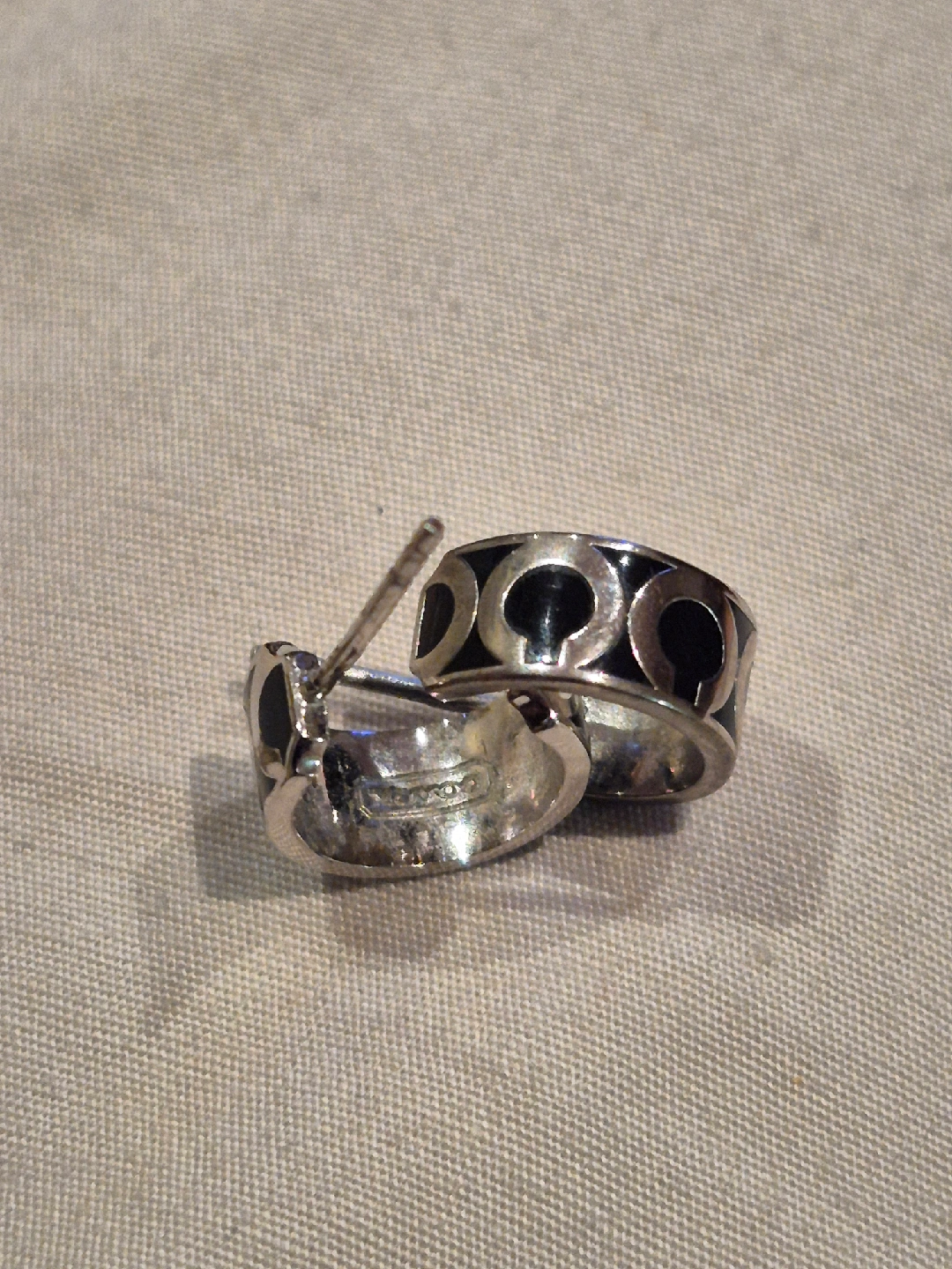 Selling a pair of Coach hoop earrings! They feature a silver tone with black detailing. Perfect for adding a touch of style to any outfit