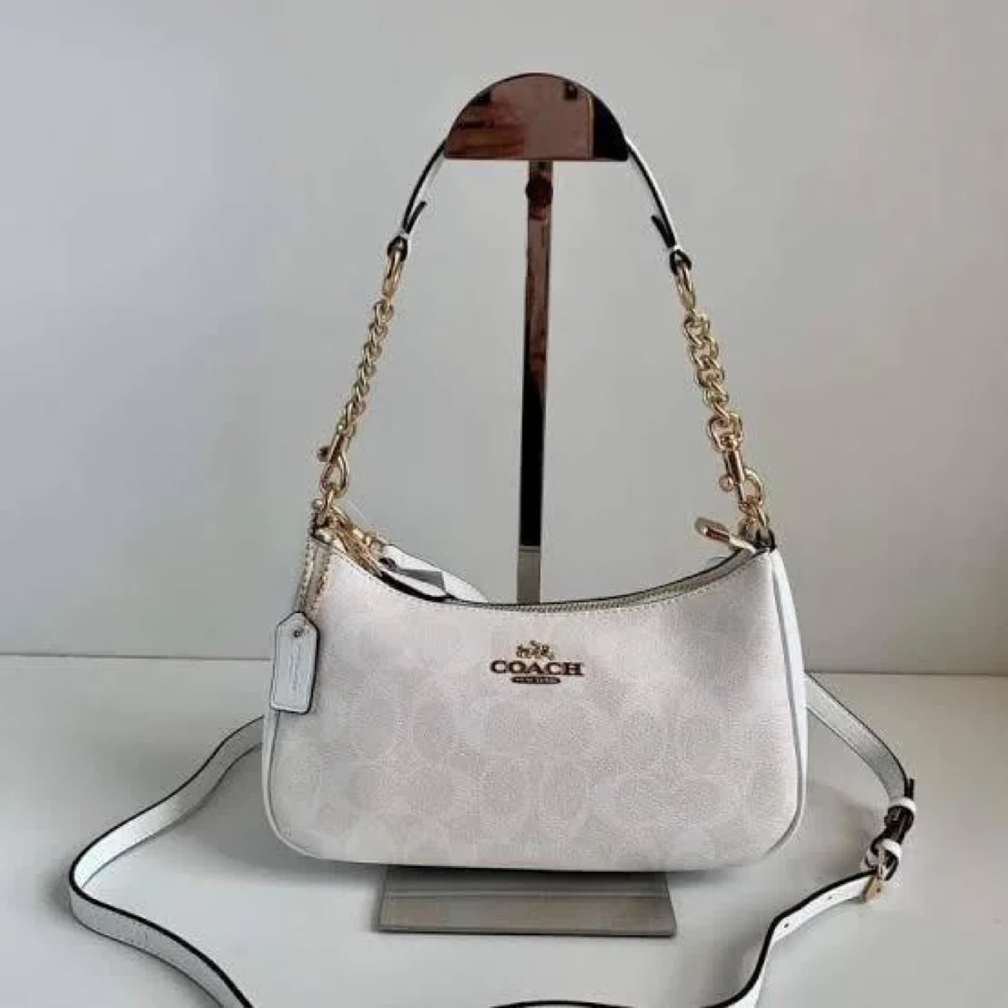 Selling a Coach Kira crossbody bag in the signature white colour. It features a chain strap and an additional crossbody strap. Perfect for everyday use!