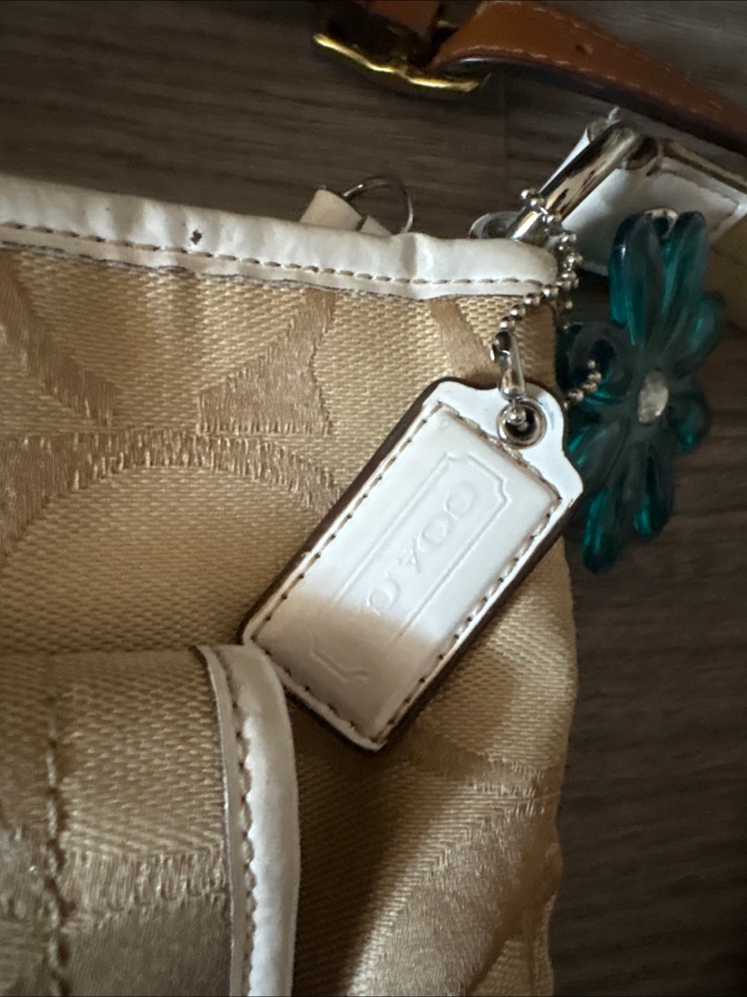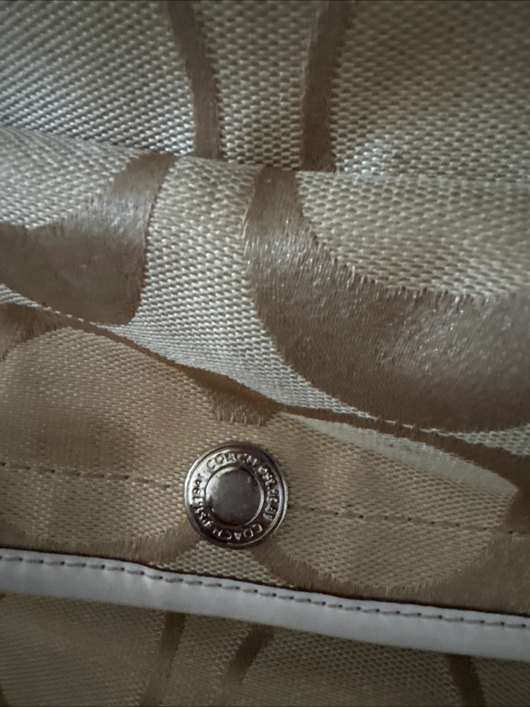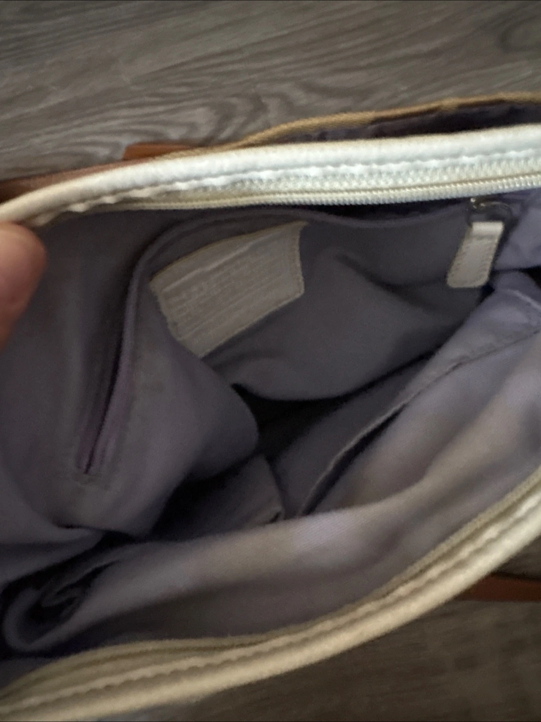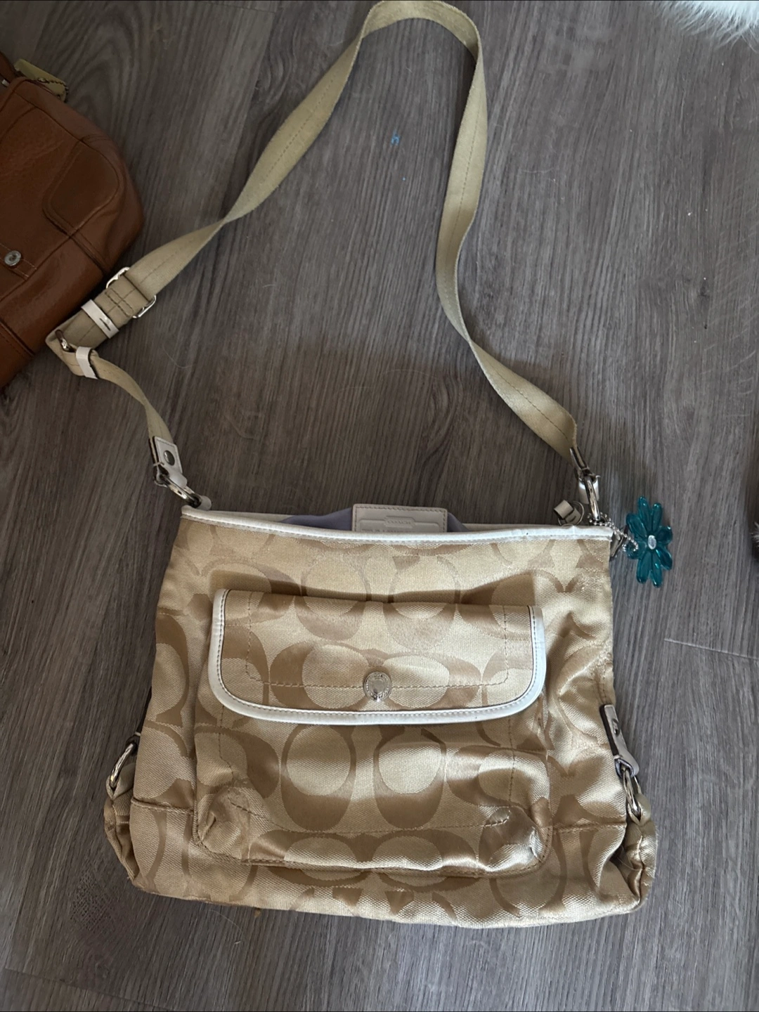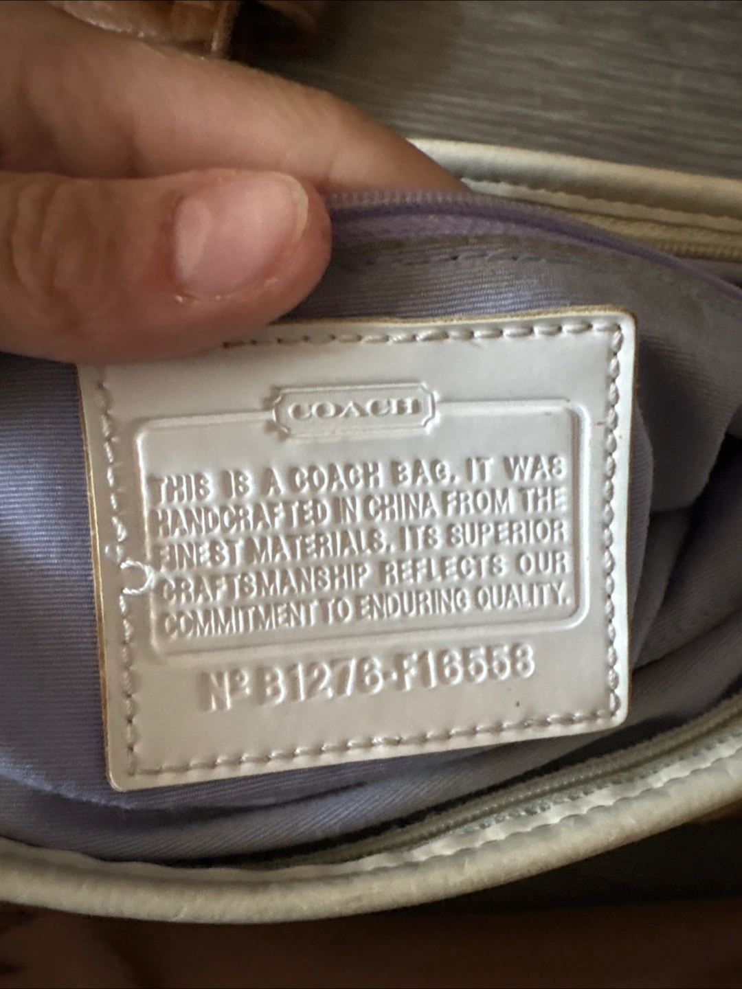 Selling a Coach shoulder bag. The bag has a beige exterior with the Coach logo pattern. The interior is a light purple colour. The model number is B1276-F18558.