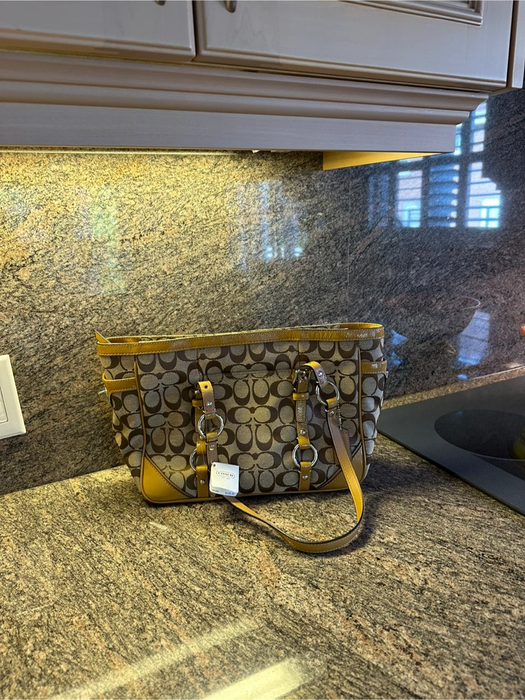 Selling a Brand new with tags Coach tote bag featuring the signature Coach pattern in brown. It's in great condition and perfect for everyday use. The bag has a classic design with brown leather trim. Brand new Pet free and smoke free home AUTHENTIC