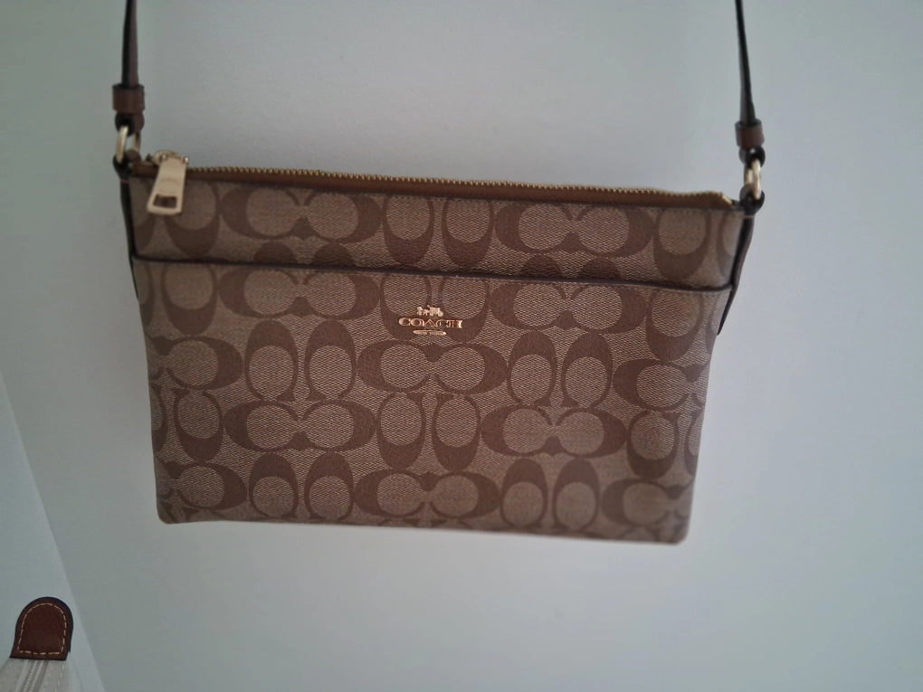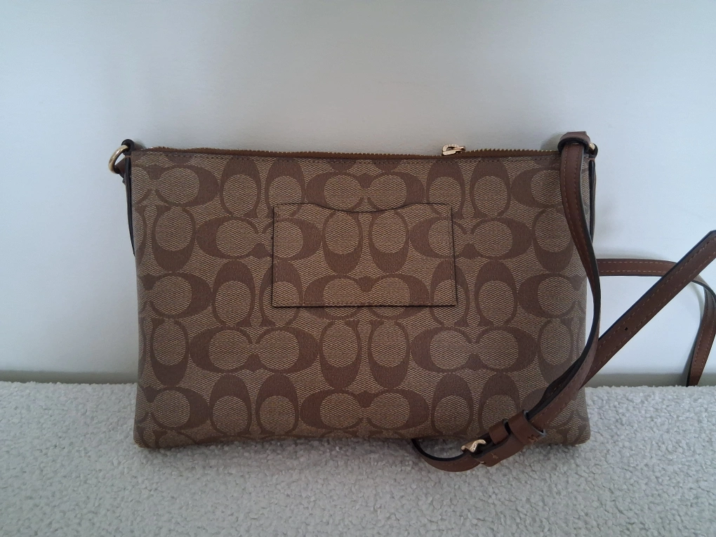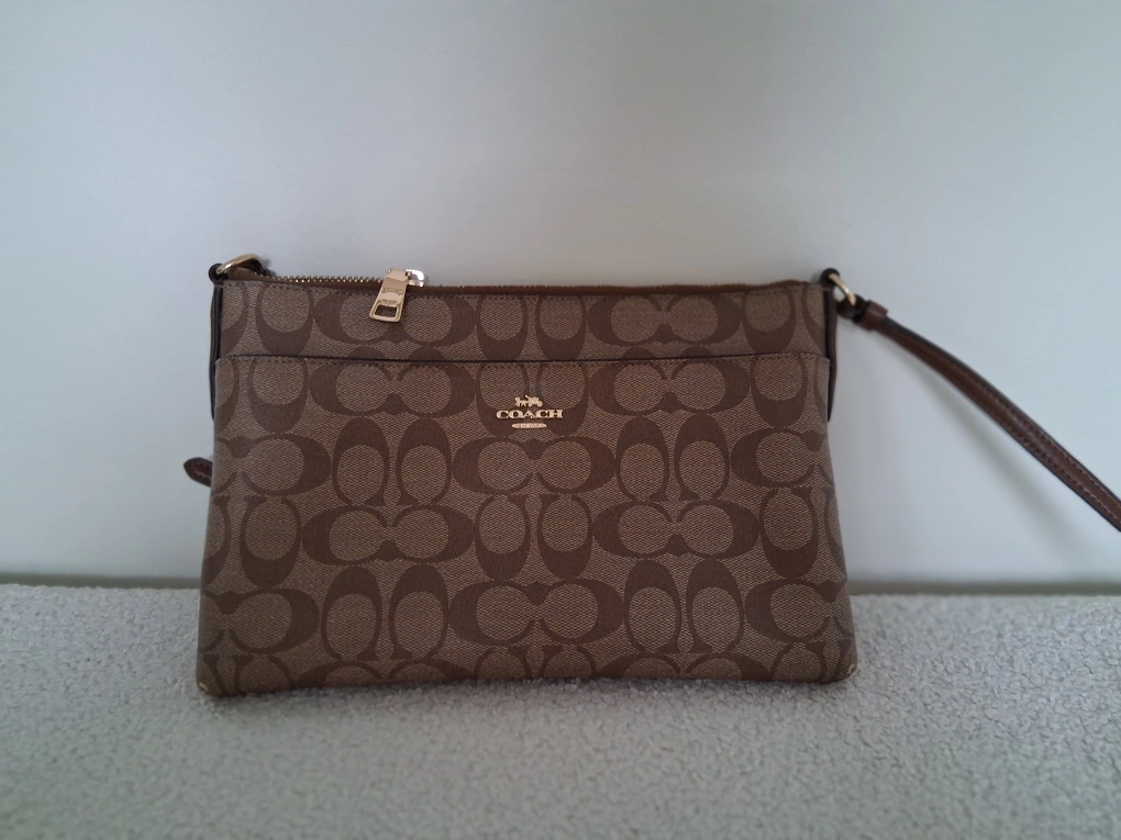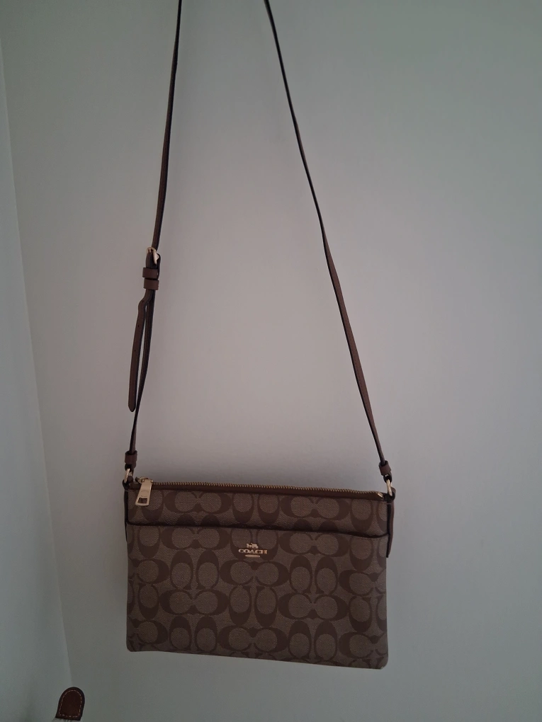 Selling a gently used Coach crossbody bag in the signature brown pattern! It's perfect for everyday use and keeping your essentials organized. The bag features a zip-top closure and an adjustable strap for comfortable wear. It's in great condition and ready for a new home