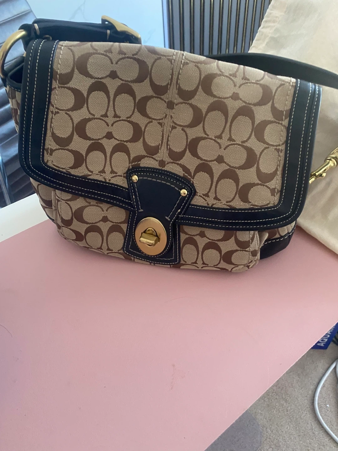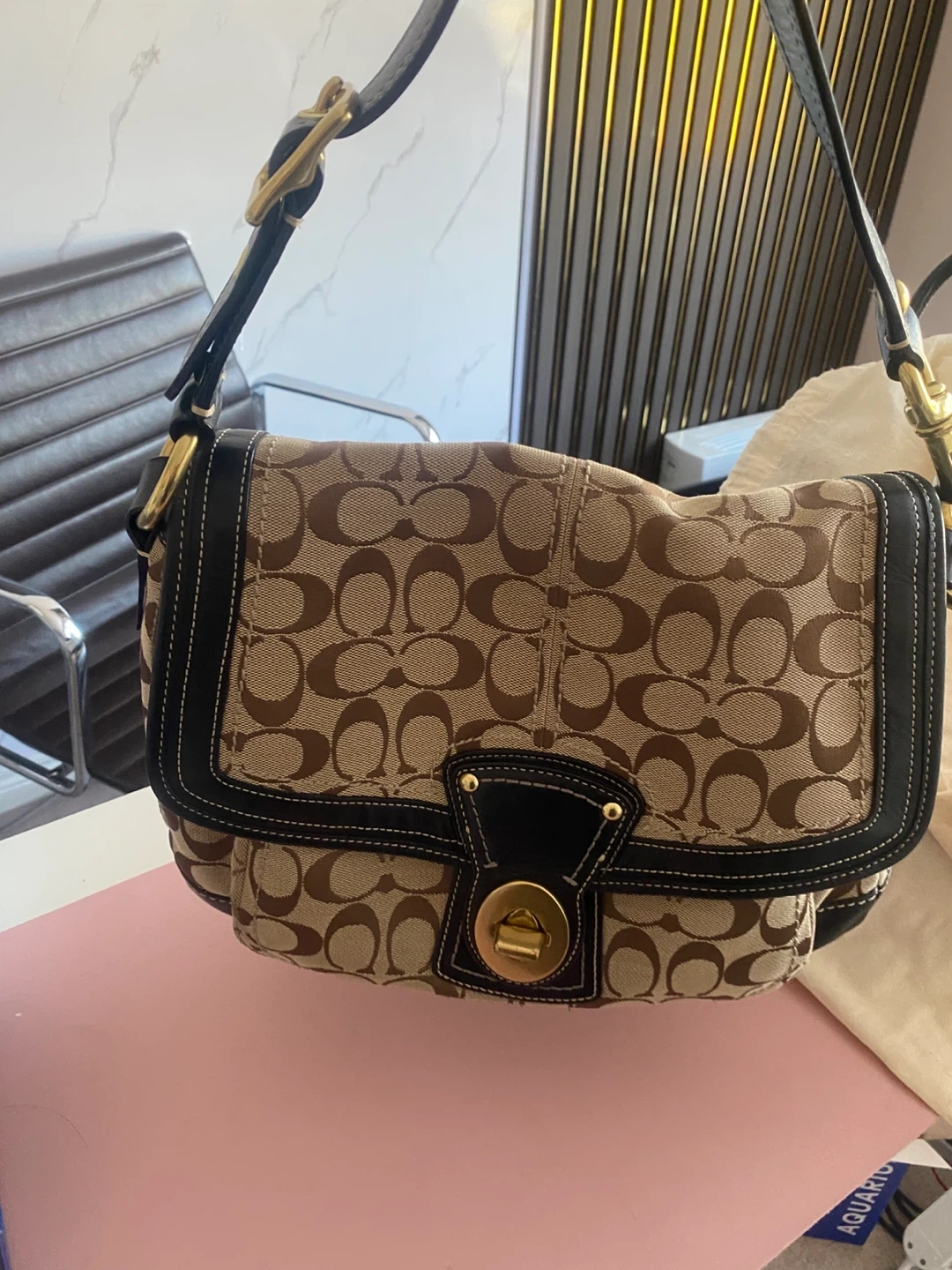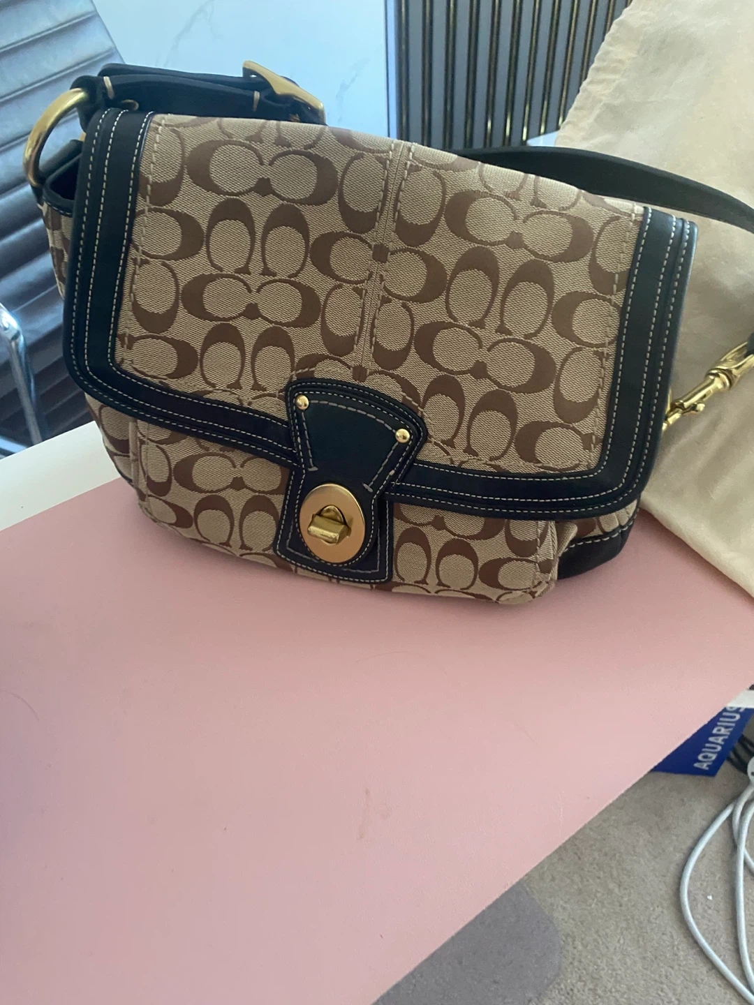 Selling a Coach satchel with the signature jacquard pattern. It features black trim and gold hardware. It's in great condition and comes with a dust bag!