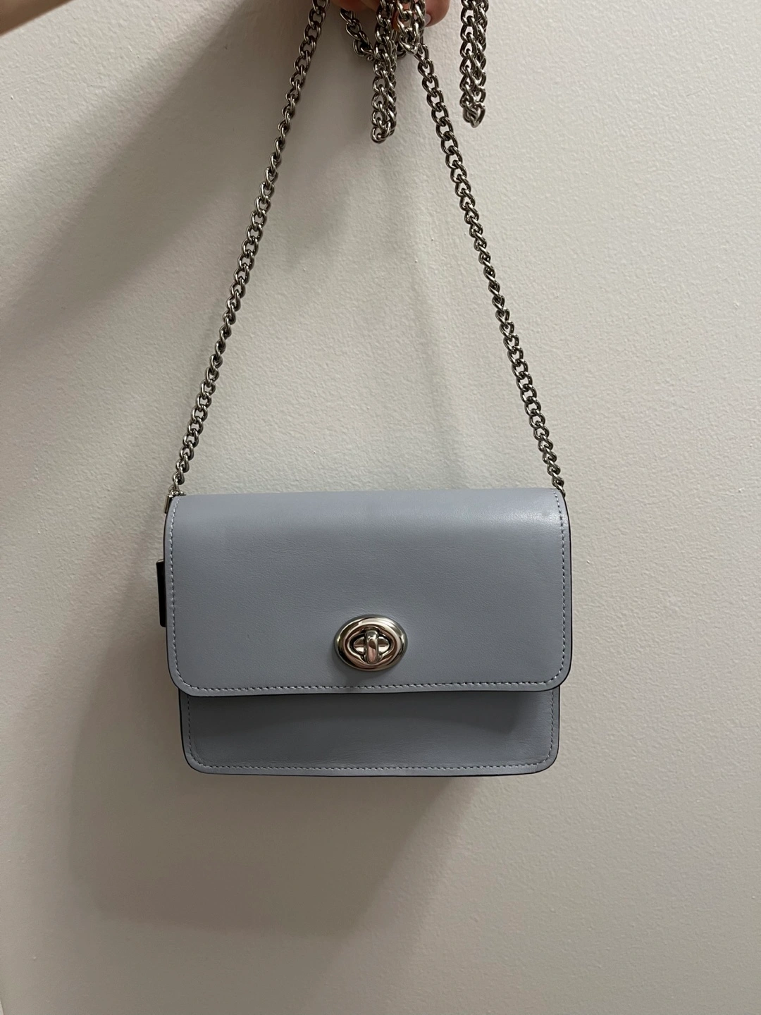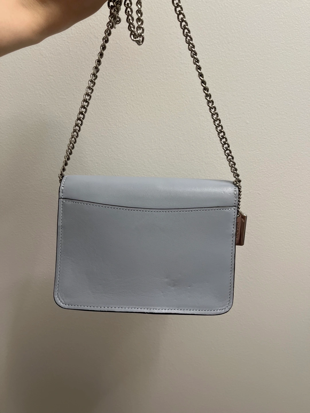 Beautiful small Coach crossbody bag. Light blue leather exterior. Silver chain strap. Subtle Coach logo. Perfect for everyday use. Size: ~17x13x7 cm 80% new, in good condition
