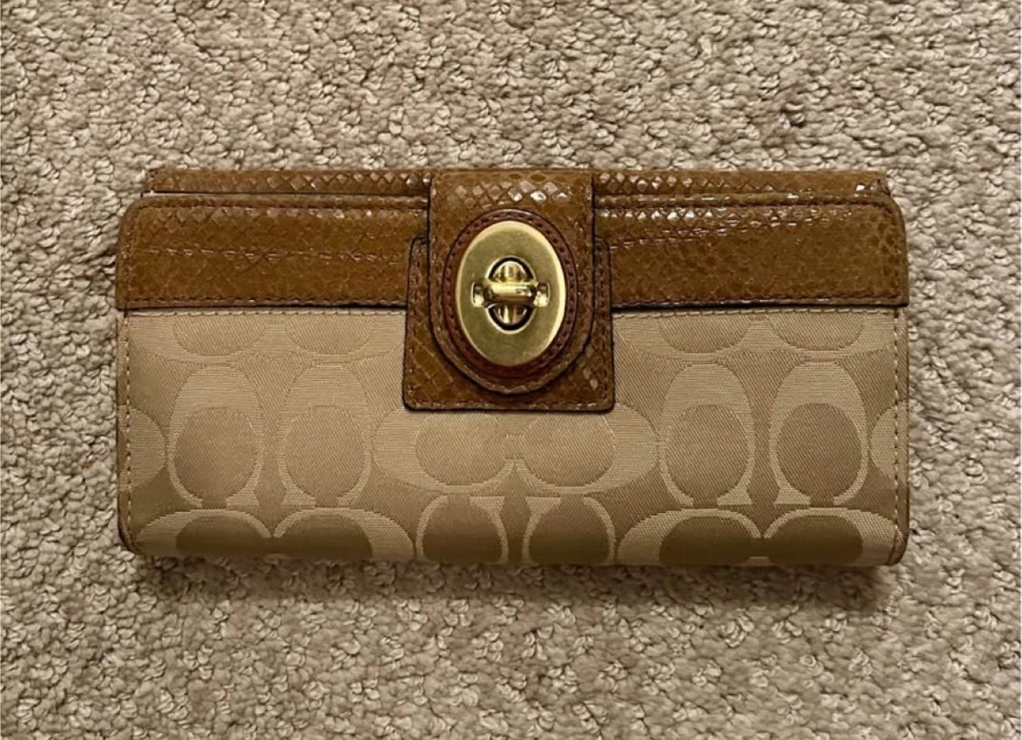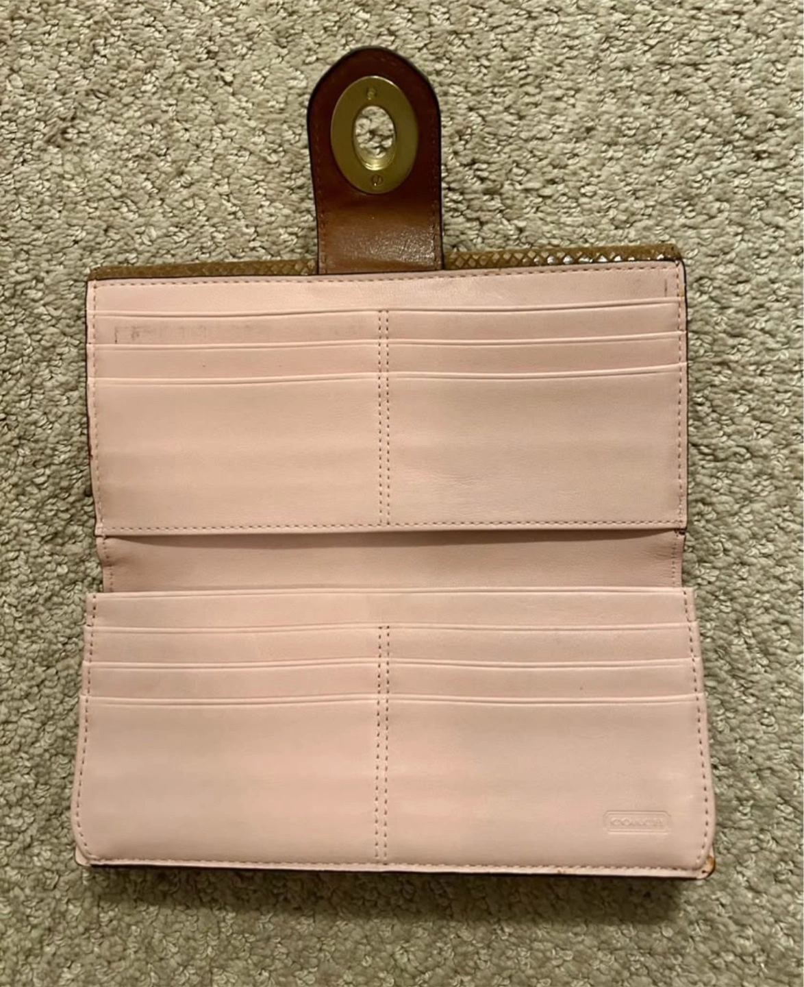 Selling a Coach wallet in good condition. It features the classic Coach logo pattern on the exterior and a turn-lock closure. The interior is lined with pink leather and has multiple card slots and compartments. It's a stylish and practical accessory!