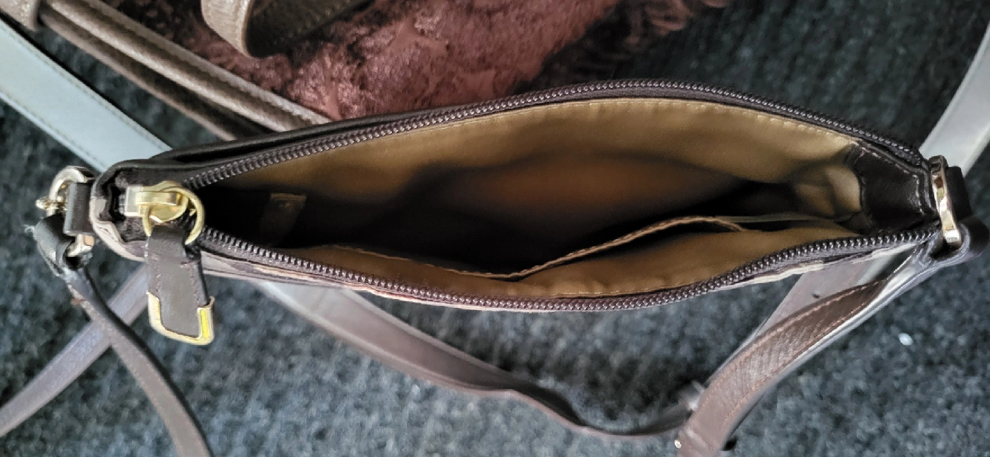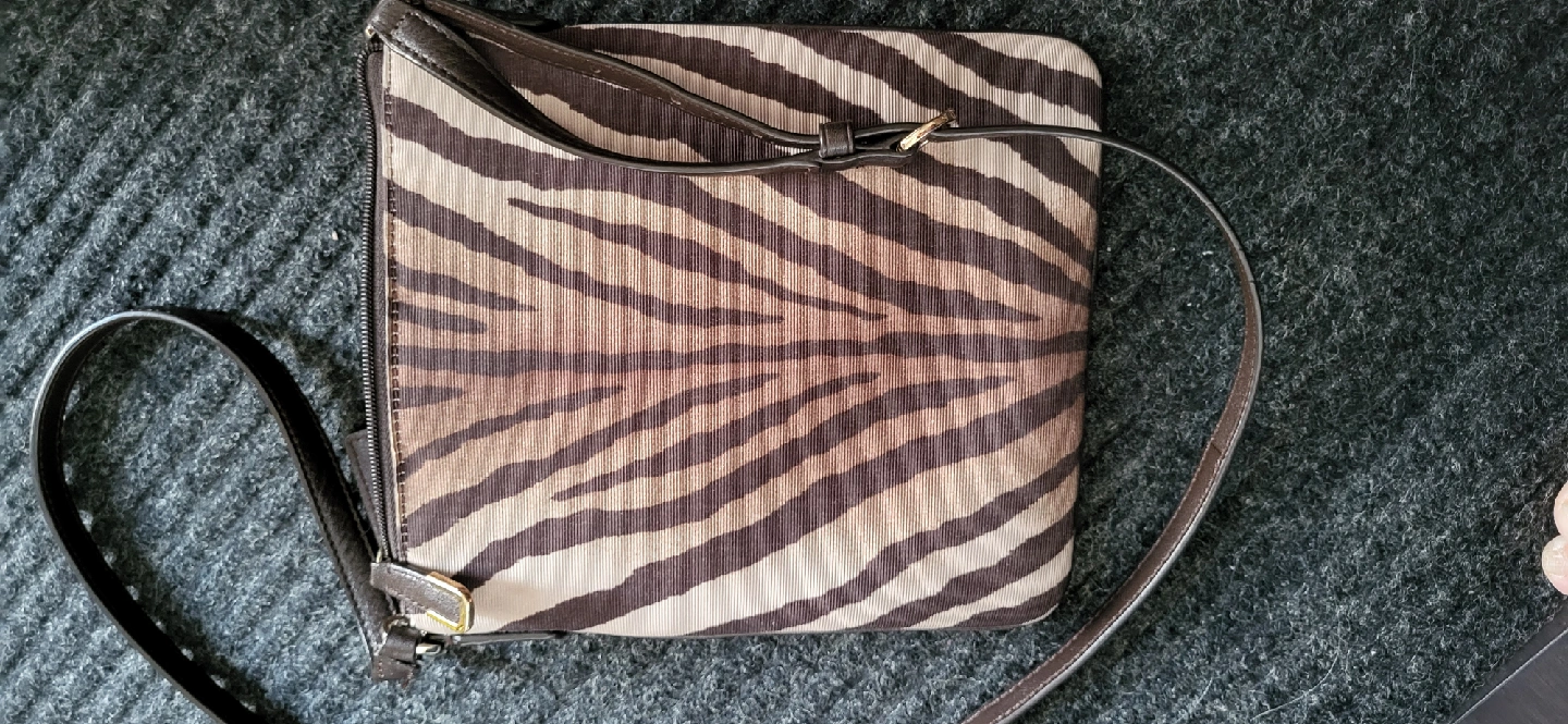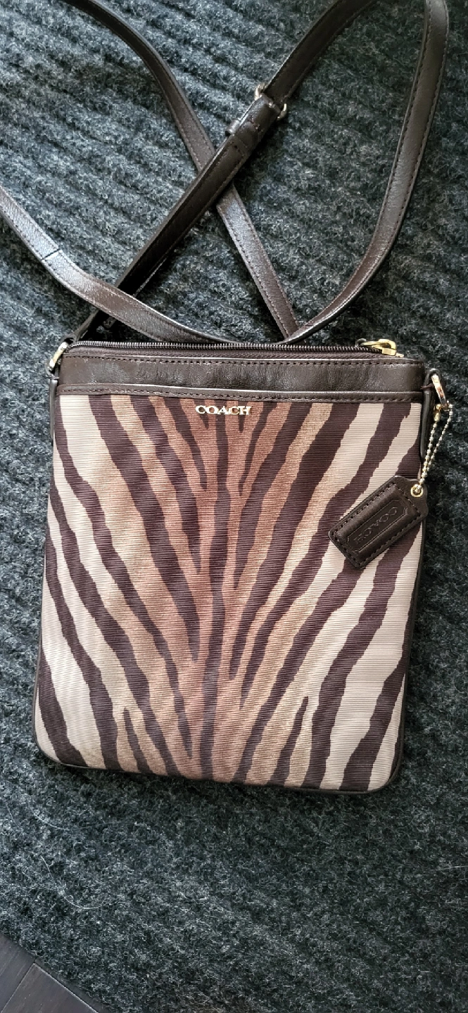 Selling a cute Coach crossbody bag with a zebra print! It's in great condition and perfect for carrying your essentials. The bag features a brown leather trim and a gold Coach logo. It's a stylish and practical accessory for everyday use