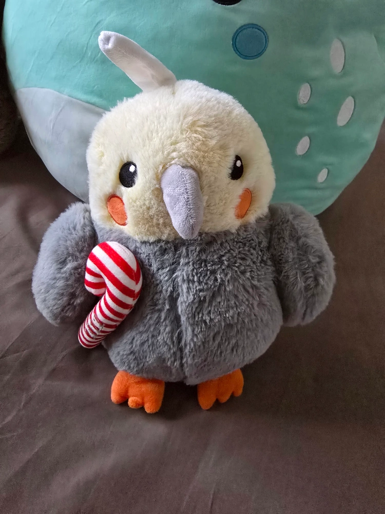 Selling a cute cockatiel plush toy! It's grey and white with orange feet and has a little candy cane. Perfect for a gift or just to add to your plush collection!