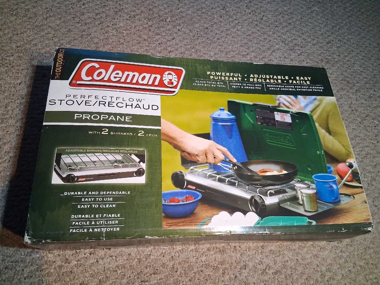 Get ready to cook up a storm outdoors with this Coleman PerfectFlow 2-burner propane stove! Almost New in box and ready for adventure, this stove features two adjustable burners for precise cooking control, perfect for camping trips or backyard cookouts. Used one time only Additional features include: * PerfectFlow™ technology for consistent performance * Two adjustable burners * Durable and easy to clean * Compact design for portability